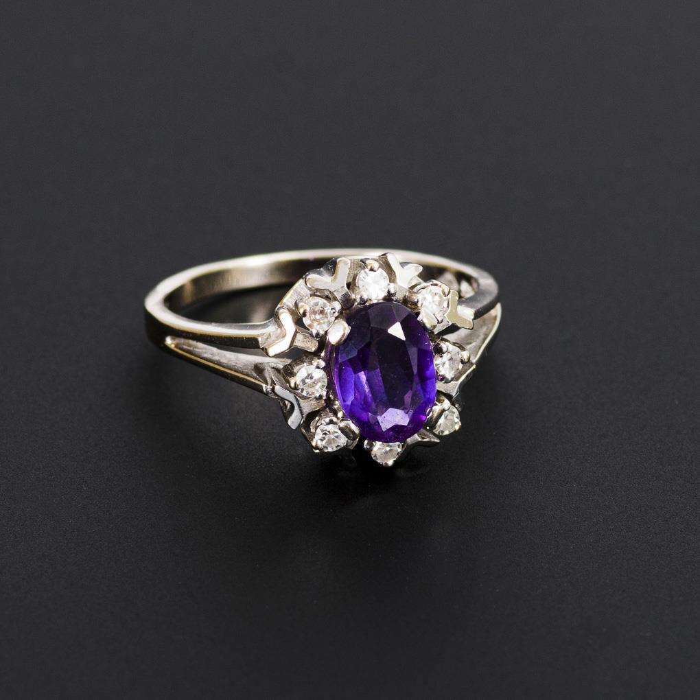 Amethyst, umringt von 8 kleinen Diamanten, zwischen schmaler Schiene.