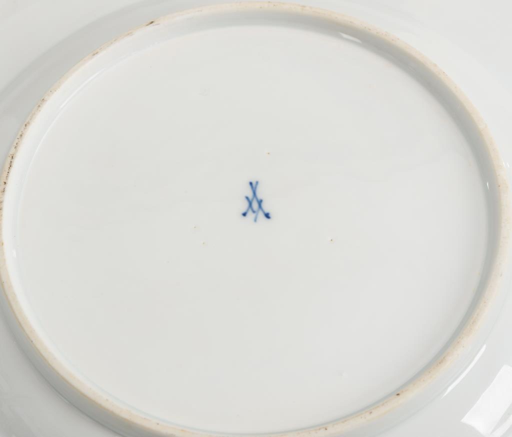 Teller in der Form "Dulong". Im Spiegel eine galante Szene, auf der Fahne kleine Blumenbuketts und Insekten.