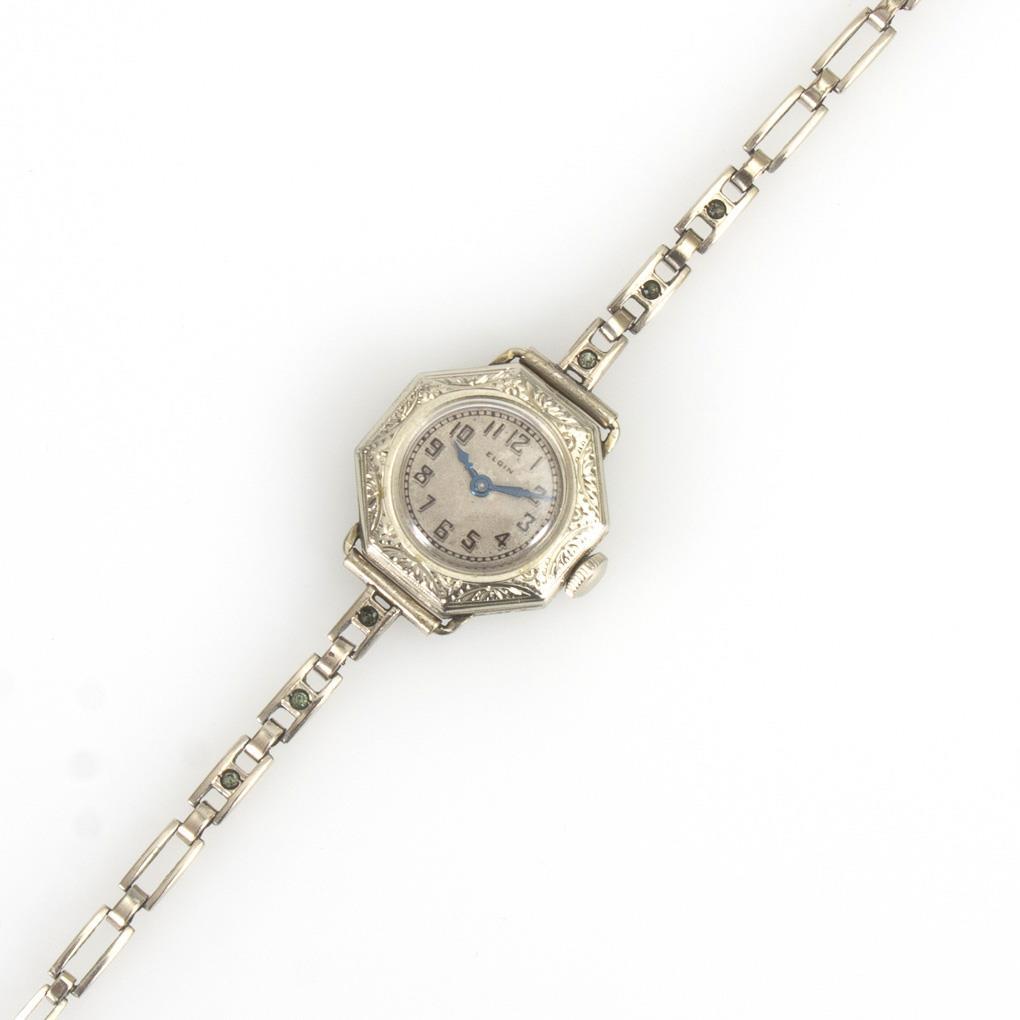 Weißgold 585 geprüft (Gehäuse). Amerikanische Uhrenfabrikation. Gehäuse 2,5 x 2,5 cm. L 19,5 cm. 20,2 g.