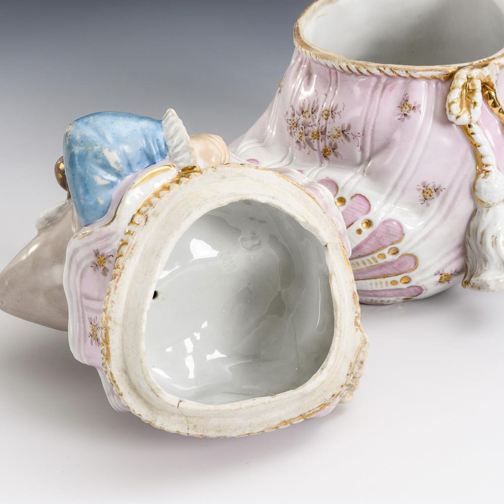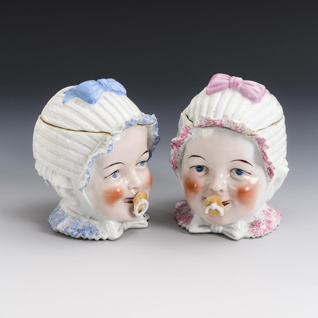 2 Dosen in Form von Babyköpfen und 1 Dose in Form eines in einem Säckchen sitzenden Kindes. Mit Defekten.