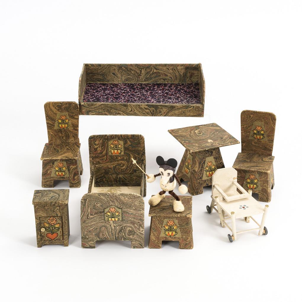 Mit Marmorpapier beklebte Möbel: 2 Betten, 2 Stühle, Hocker, Tisch und Nachtschränkchen. Dazu ältere Watte-Comicfigur Mickey Mouse und weiß gestrichener Hochstuhl zum Umklappen. Maus und Hochstuhl mit Altersspuren.