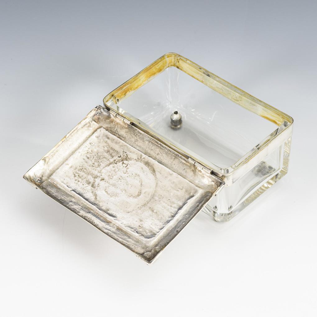 Klarglaskorpus auf 4 Silberfüßchen. Reliefierter Scharnierdeckel "RWAC. Rheinisch-Westfälischer Automobilclub e.V. Clubpreis 1927". Deckel mit minimalem Defekt.