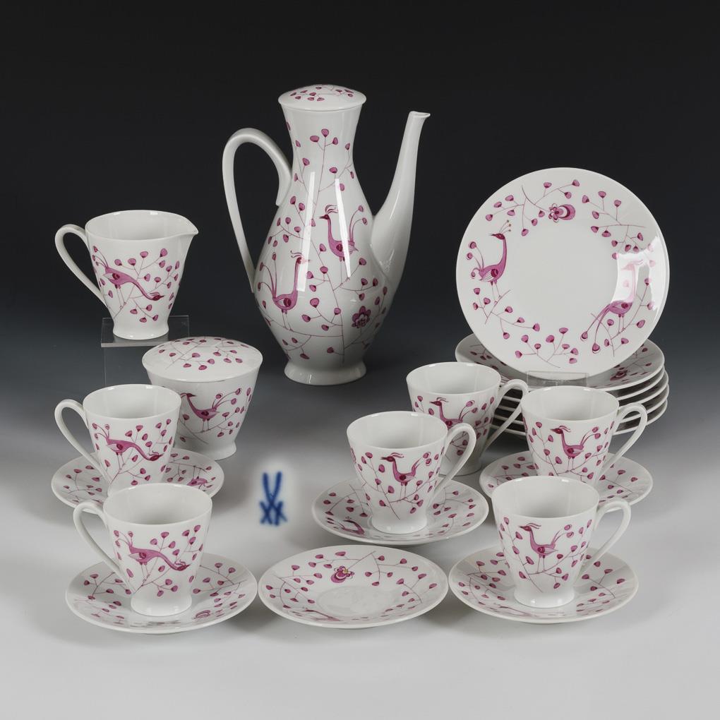 21 Teile. Mokkakanne (H 21,5 cm), Milchkännchen, Zuckerdose, 6 Tassen, 6 Untertassen und 6 Gebäcktelle. Mit purpurfarbenem, indianischem Blumenmuster mit Paradiesvögeln.