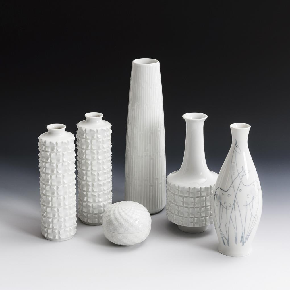 1x Vase mit geometrischem Relief, Entwurf Hans Merz (1895-1974; H 32,5 cm). / 2 Zylindervasen und 1 Enghalsvase mit Steinelrelief, Entwurf Ludwig Zepner (1931-2010); H 22,5 cm). / 1x Zuckerdose mit Blütenrelief (H 7,5 cm). / 1x schlank-ovoide Vase mit der Darstellung von Tieren (H 25 cm).
