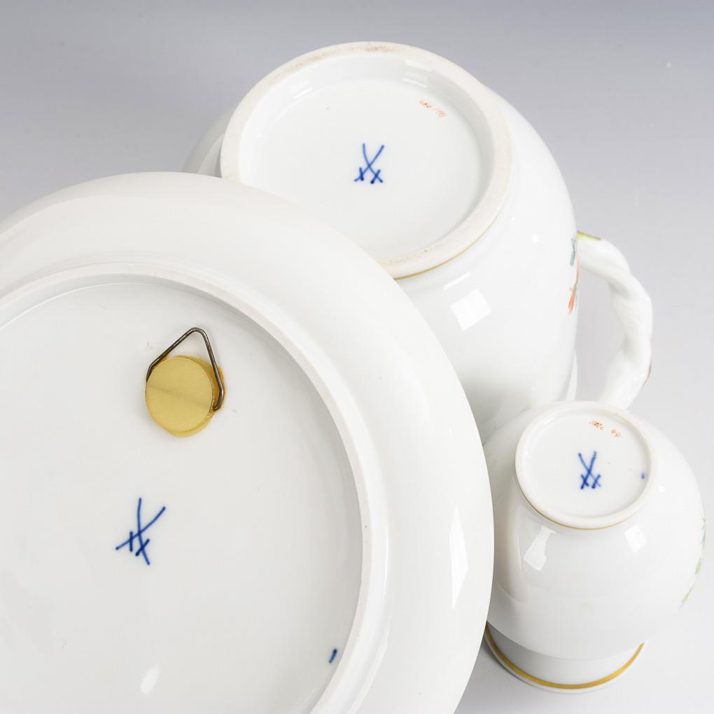 Teller mit Vogelmalerei, Cachepot und Väschen. Meissen.