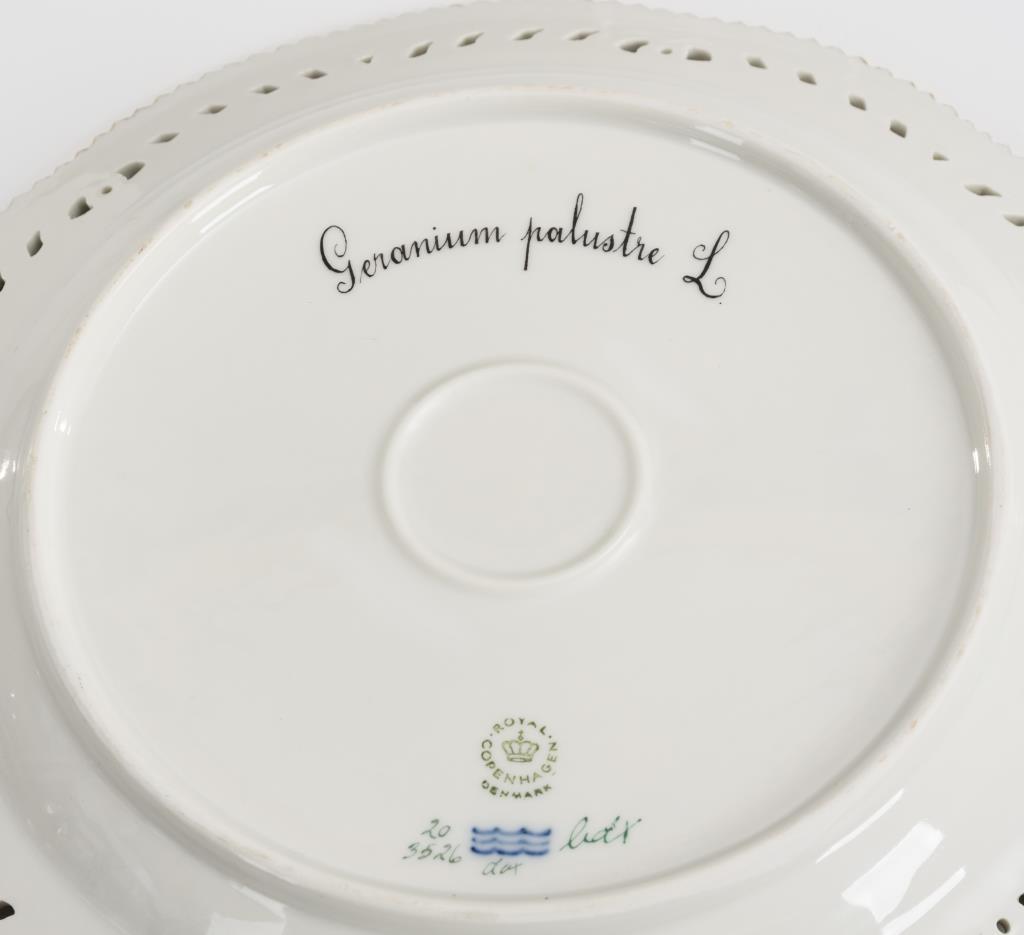 Teller mit durchbrochener Fahne und Zackenrand. Im Spiegel die Darstellung eines Sumpfstorchschnabels, unterseitig lateinisch bezeichnet.