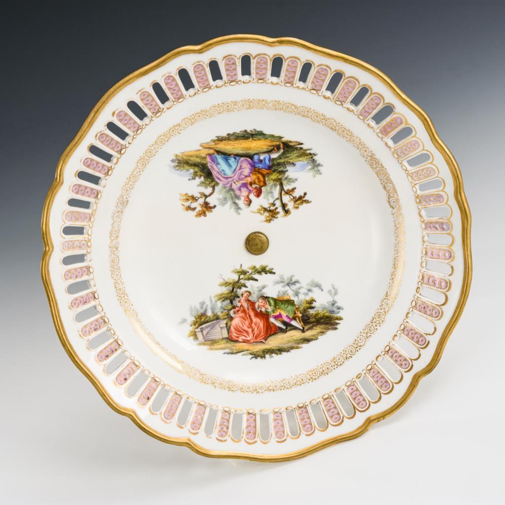 Teller in der Form "Neuer Ausschnitt" mit stabdurchbrochener Fahne, auf Rundfuß. Im Spiegel zwei kleine Parklandschaften mit einer galanten Szene. 2 Randrestaurierungen.