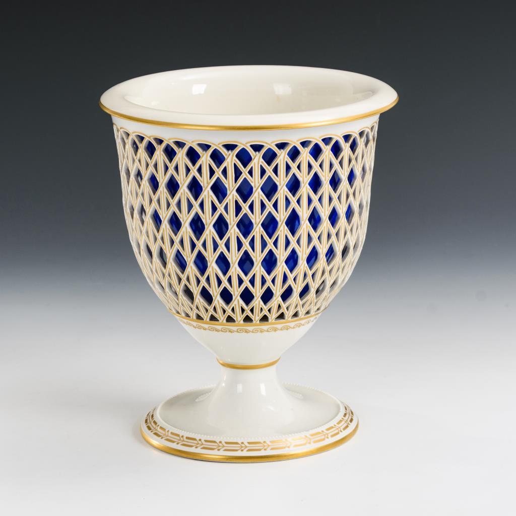 Glockenförmige, gitterartig durchbrochene Kuppa mit kurzem Schaft und Rundfuß sowie entsprechend gestalteter Einsatz mit auskragendem Mündungsrand. Minimaler Goldabrieb am Korbrand, am Korb 1 Restaurierung, 1 geklebter Ausbruch sowie 2 Haarrisse.