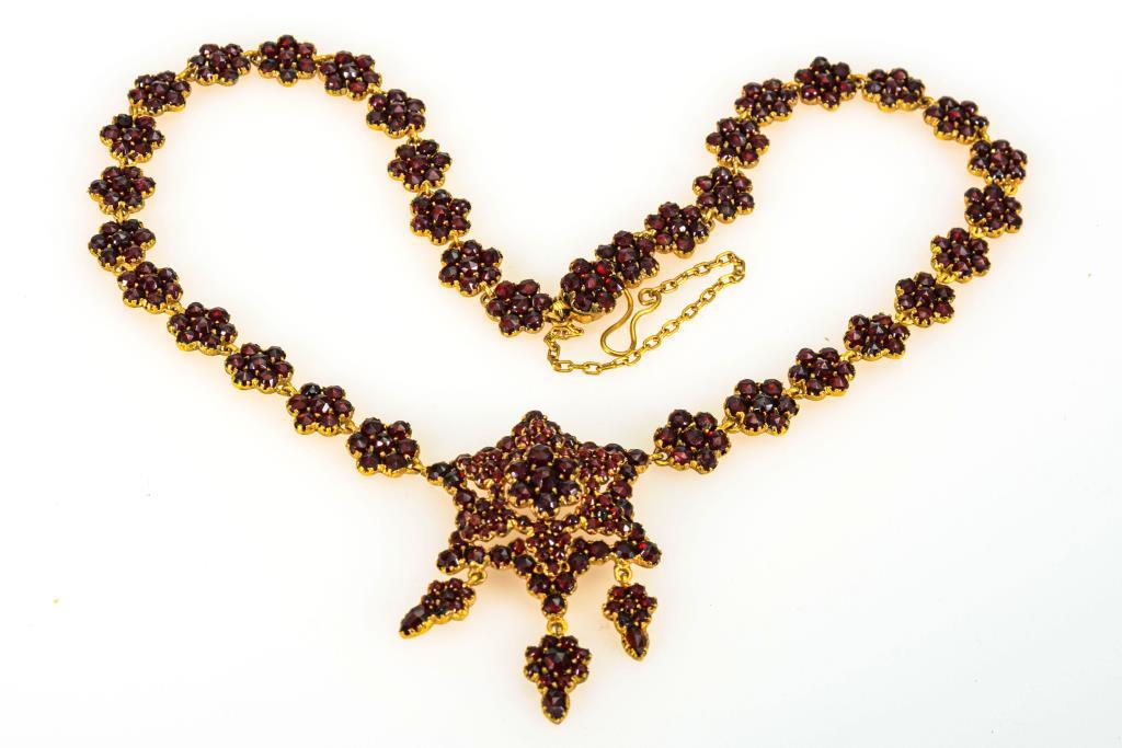 3-ebnig granatbesetzte Sternmitte mit Abhängungen, zwischen Blütengliederkette. Kastenschloss mit Sicherheitskette.
