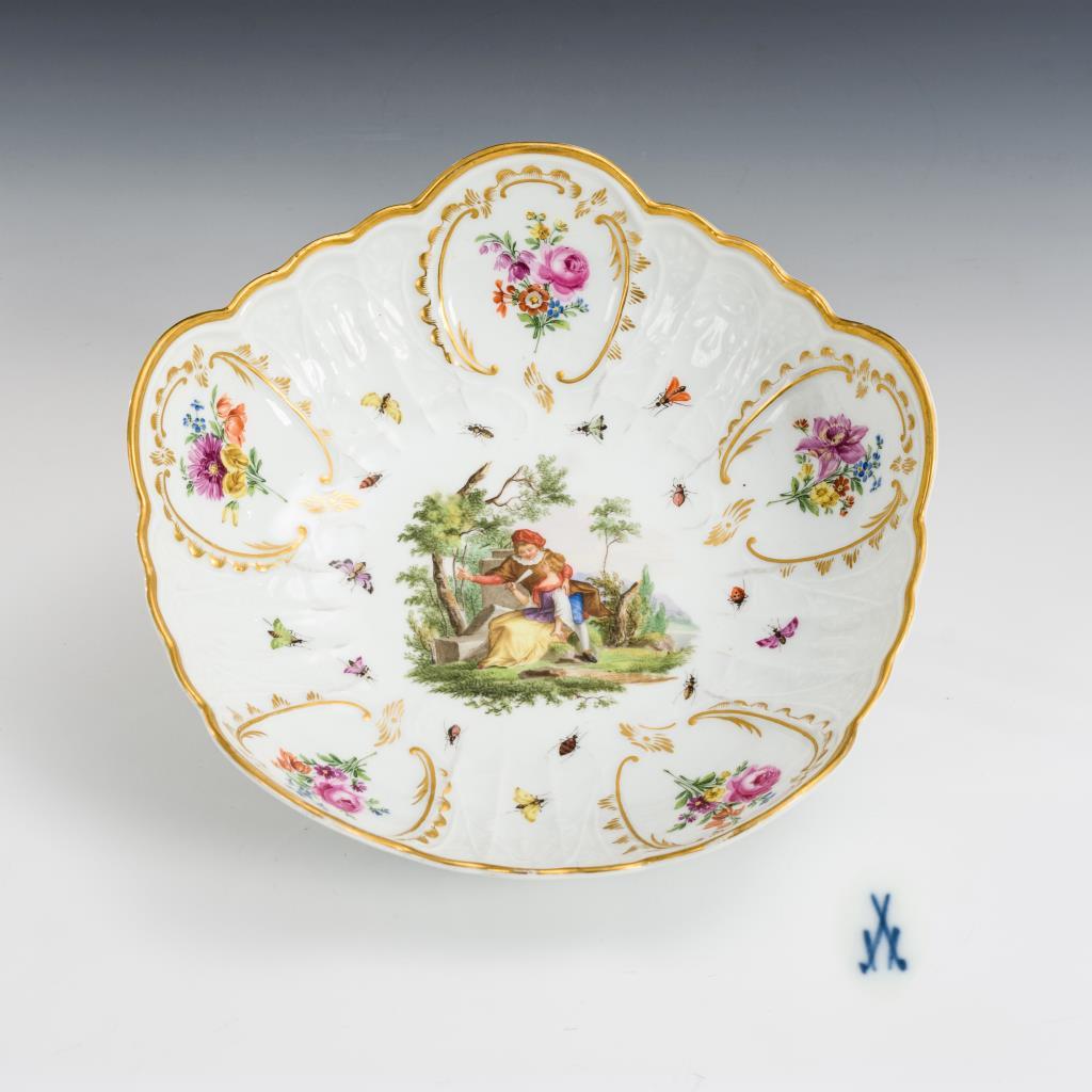 Form "Dulong". Im Spiegel eine leuchtend farbige, von Insekten umgebene galante Szene, in den Rocaillekartuschen Blumenbuketts.