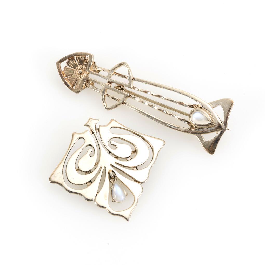 Durchbrochen gearbeitete Broschen mit kleinen Mondsteincabochons. Kugelhaken.