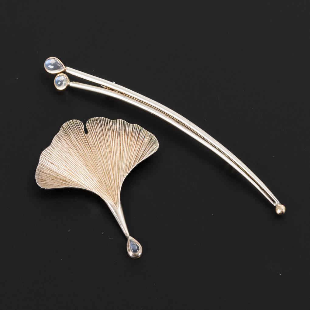 Ginkgokoblatt und lange Stabnadel mit Opalcabochons. Kugelhaken.