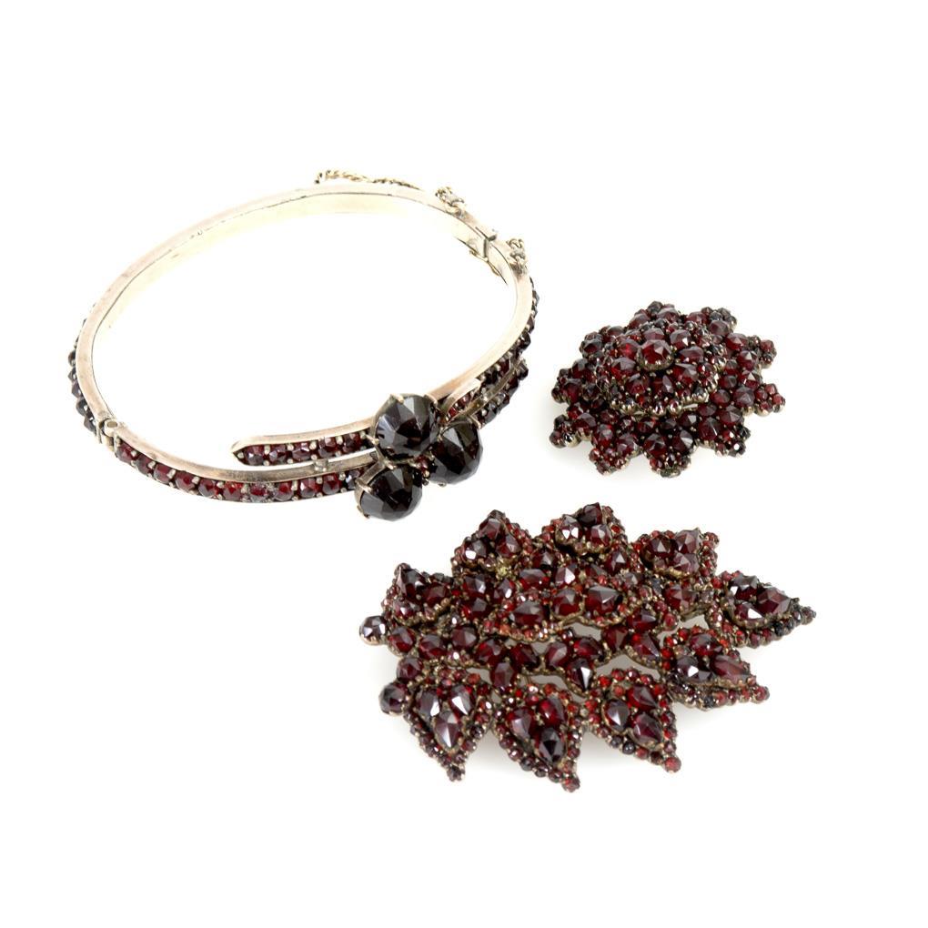 Granatarmreif und 2 Broschen Ende 19. Jh.