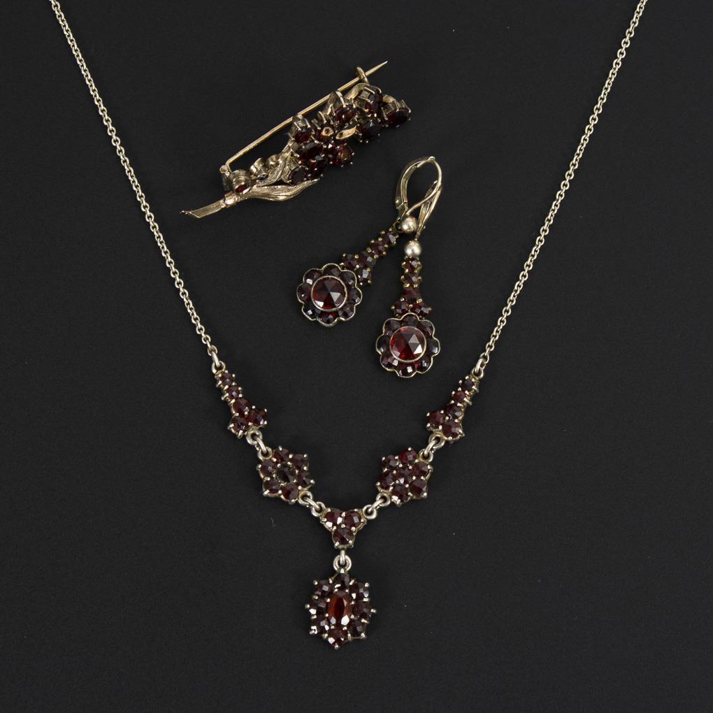 Granat-Collier, Ohrhängerpaar und Zweigbrosche.