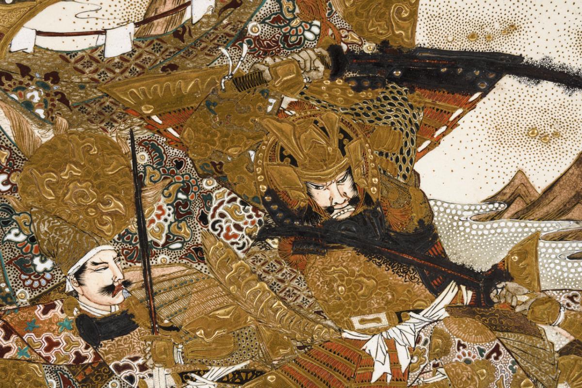 Teller mit Schwertkampfszene zwischen vier Samurais, von denen einer bereits am Boden liegt. / Vase am Boden mit Schriftzeichen. Balusterform mit zwei Bildkartuschen: Samurai und Frau sowie farbige Trichterwinde. Fuß und Hals mit ornamentaler Verzierung. Glasur ganz fein krakeliert. Teller mit alt restaurierten Brandrissen? auf der Rückseite.