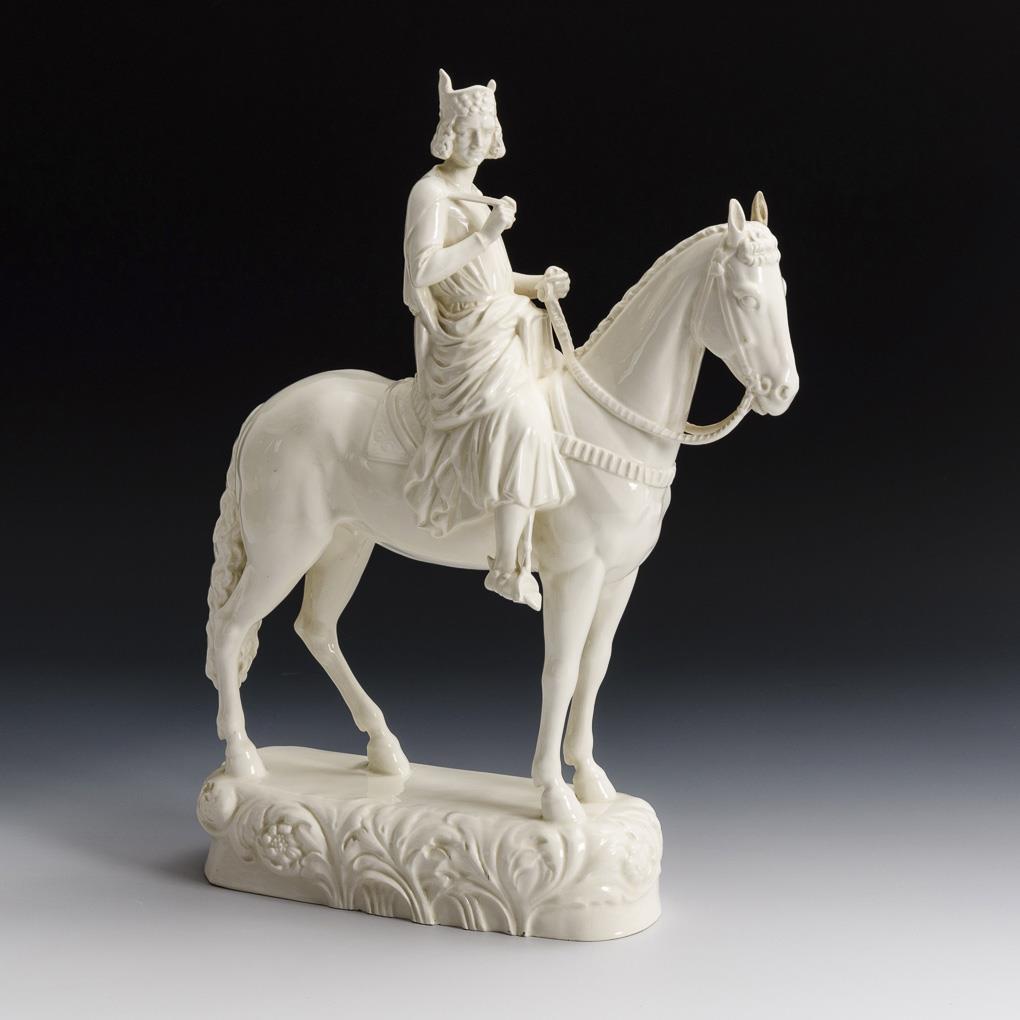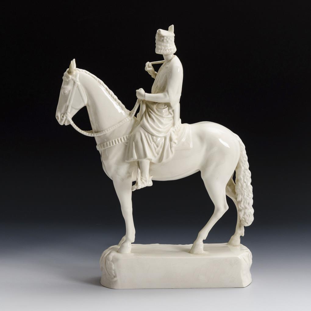 Reiterstandbild nach dem plastischen, spätmittelalterlichen Vorbild am Bamberger Dom, auf Natursockel. Linkes Pferdeohr restauriert, minimale Glasurchips am Sockel.