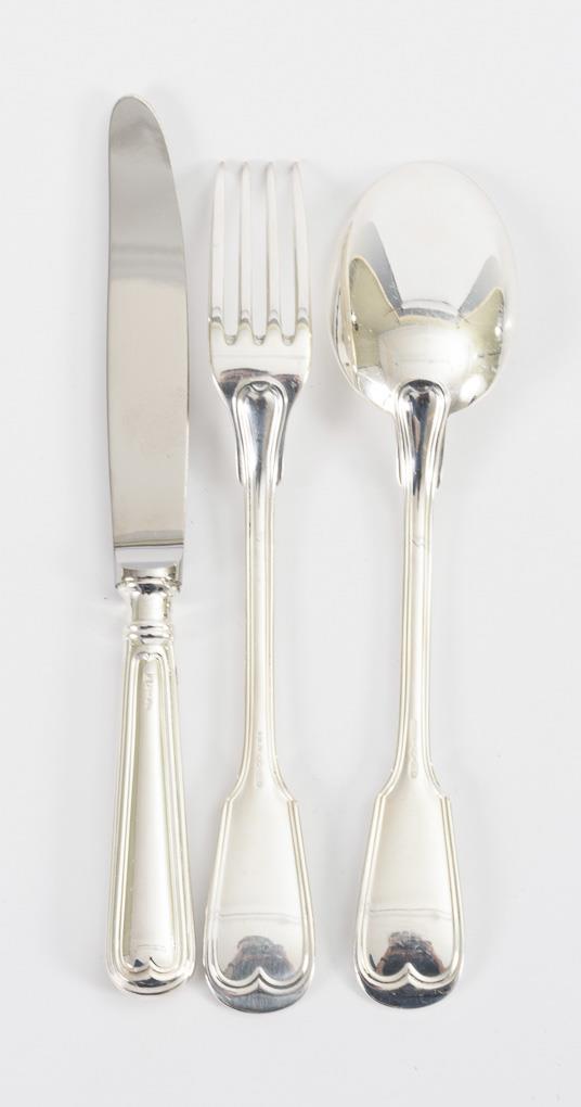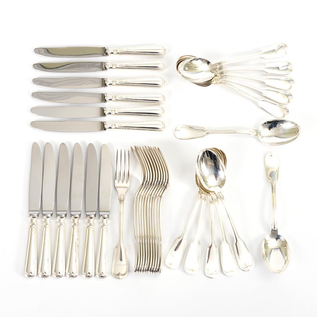 Je 12 Messer, Gabeln und Löffel mit Augsburger Faden. Einige Gebrauchsspuren.