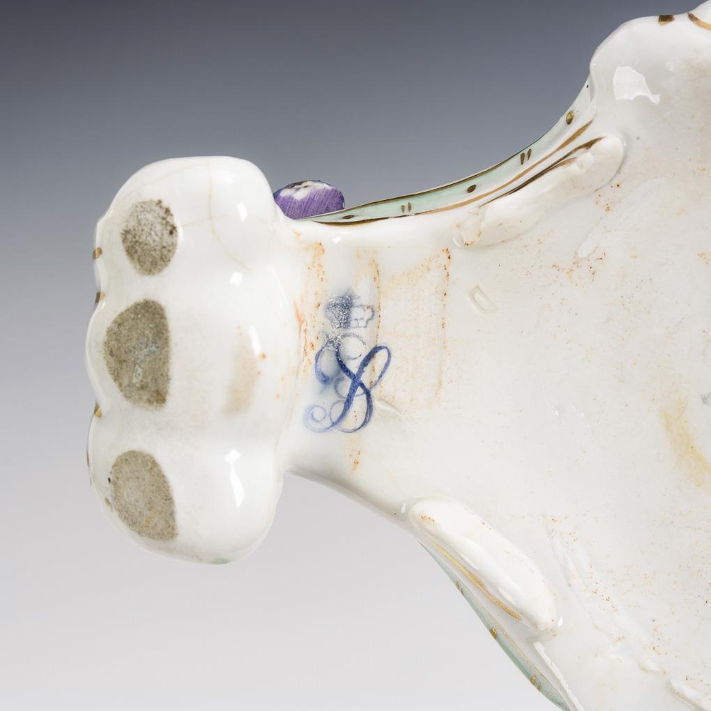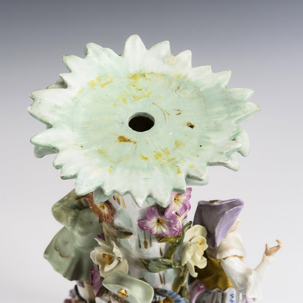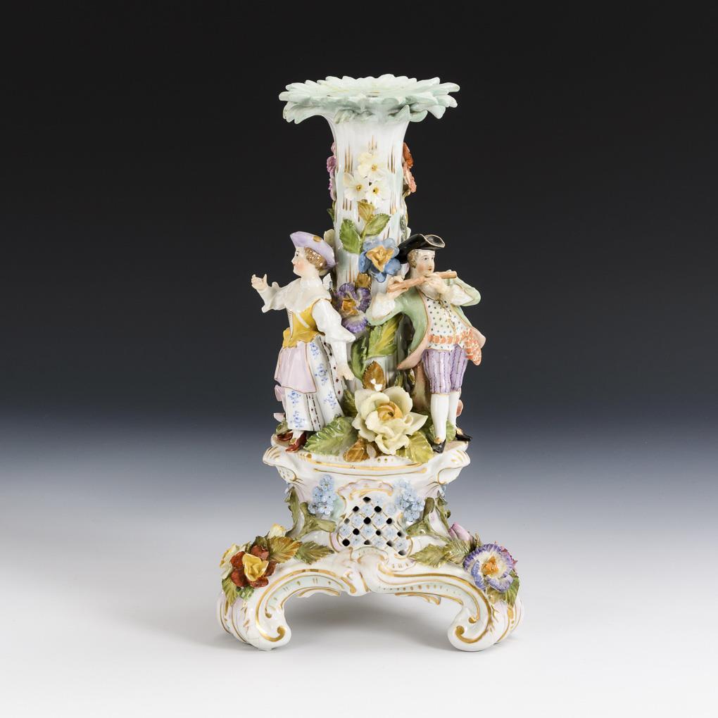 Blütenbelegter Leuchterfuß mit drei um einen Palmenschaft gruppierten Rokokofiguren, partiell gitterdurchbrochener Fuß mit drei Volutenfüßen. Ohne Leuchteraufsatz, Belag bestoßen, mit Restaurierungen.