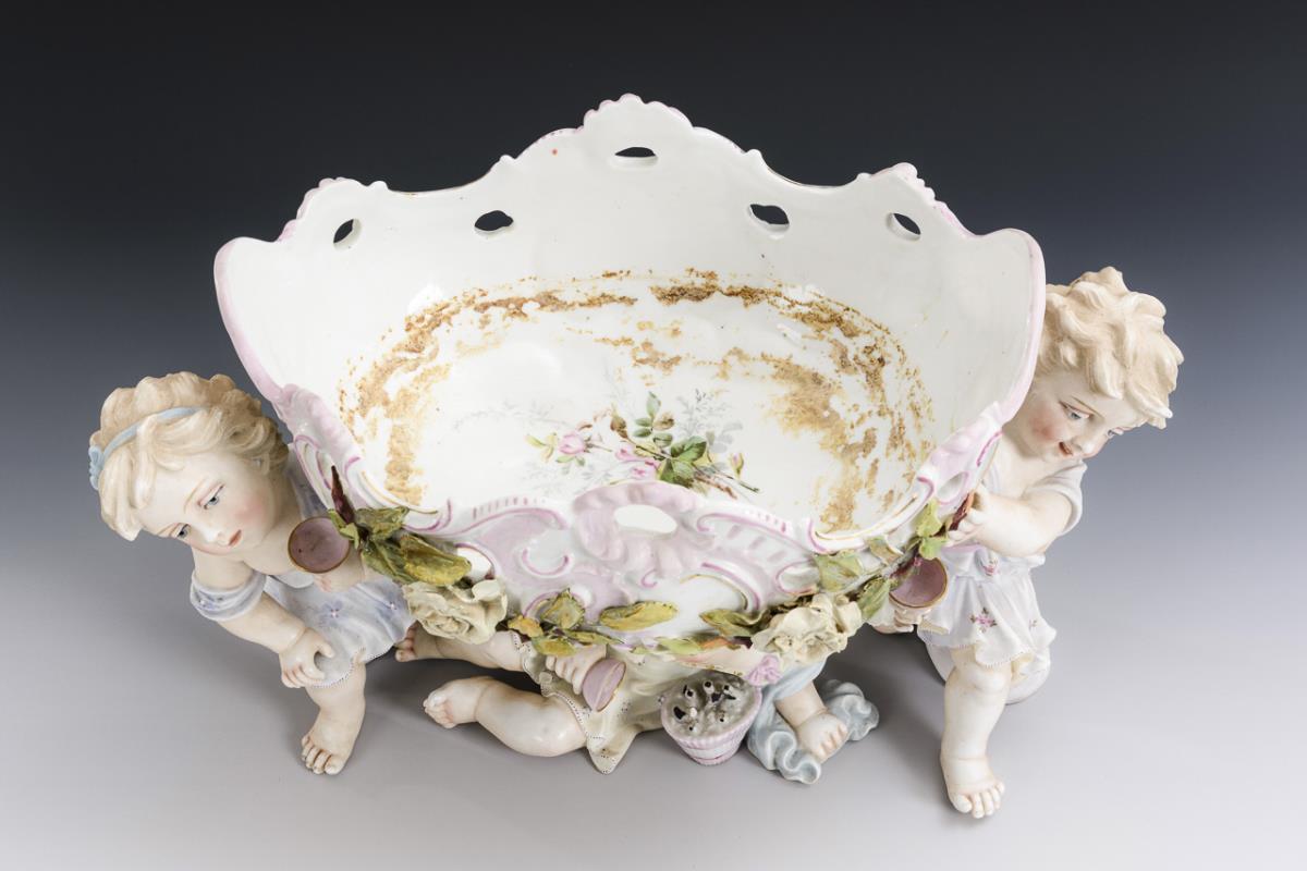 Von drei Kindern mit Weinkorb und Weingläsern getragene Schale mit Blütenbelag. Blütenbelag restauriert, 1 Hand geklebt, Ablagerungen in Schale.