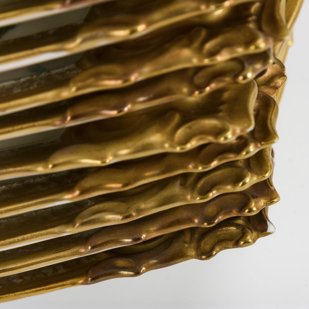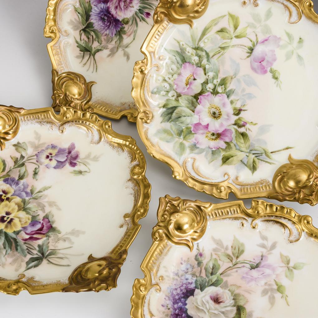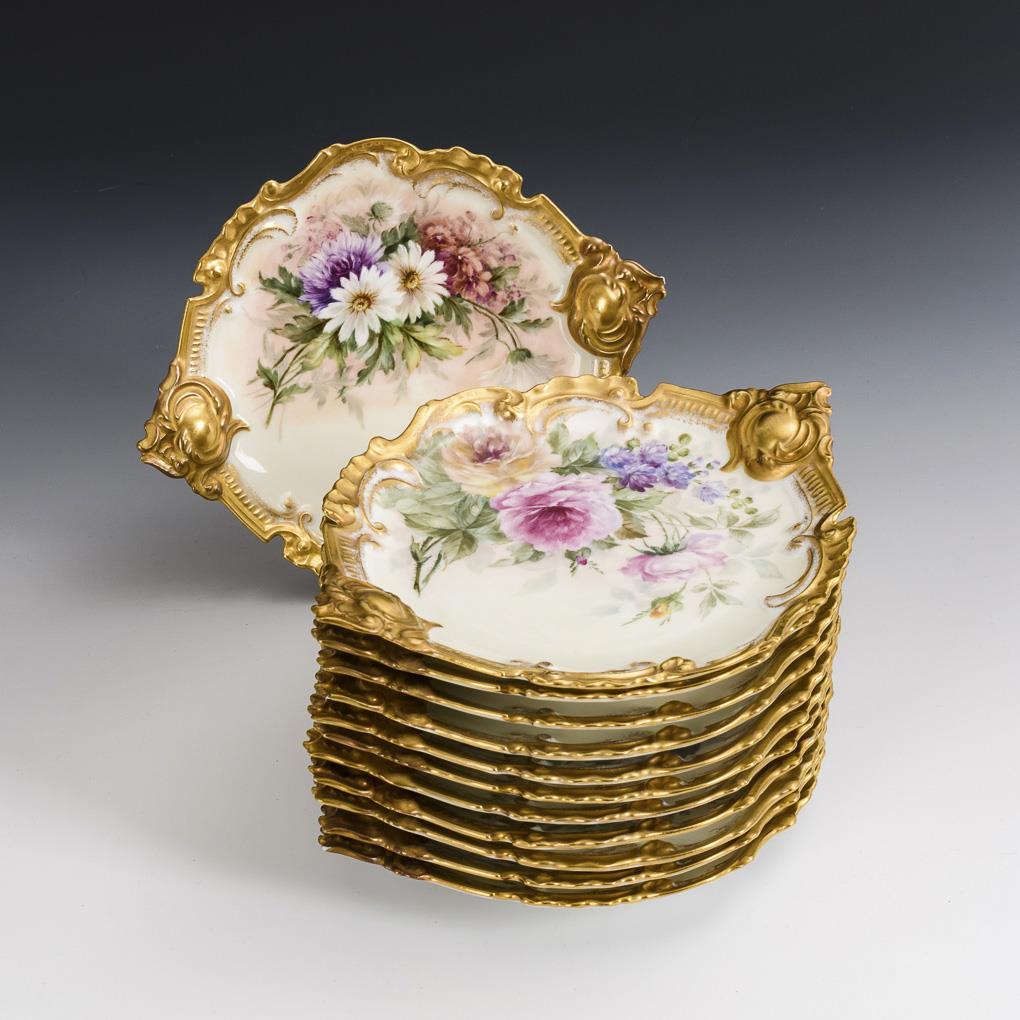 12 Kuchenteller mit goldstaffiertem Rocaillereliefrand sowie einem großen Blumenbukett im Spiegel. 1 Randbestoßung.