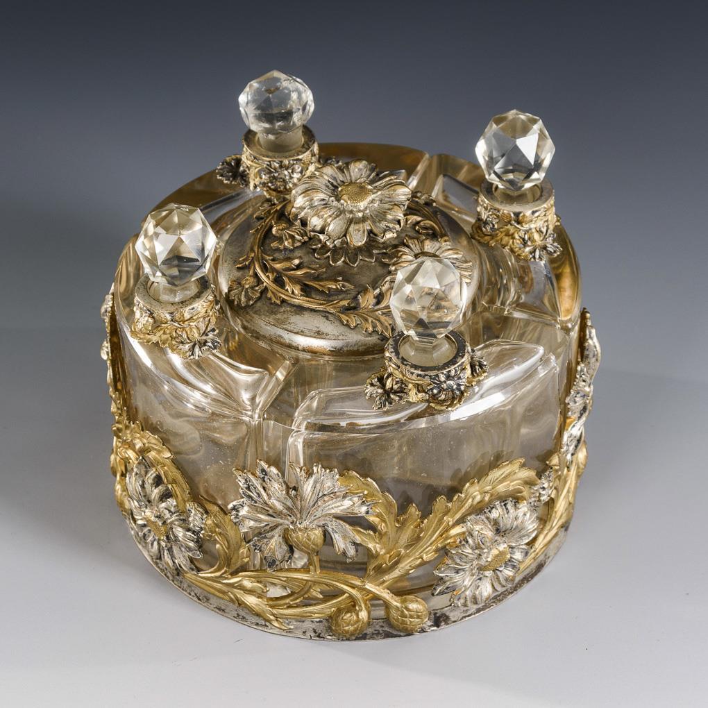 5-teiliges Set mit zylindrischer Dose und 4, die Dose umschließenden Flakons. In dekorativem à jour gearbeiteten Gestell mit Kornblumen. Mündungsränder der Flakons mit Ausbrüchen.