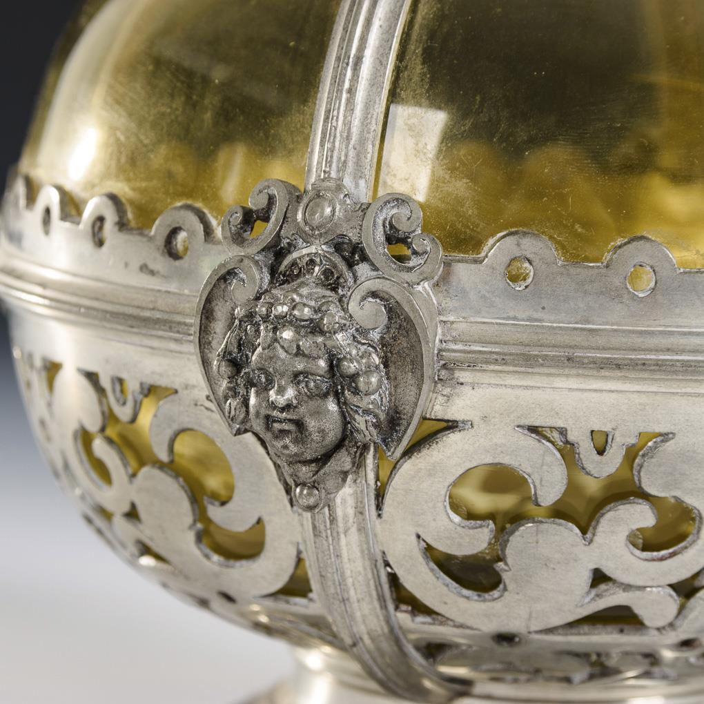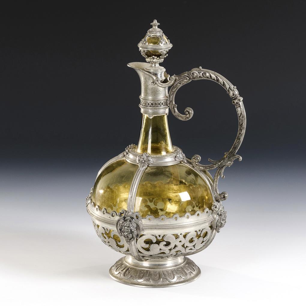 Bauchiger Korpus mit Enghals und Stopfen, gefasst von einer Metallmontierung mit Maskaronen.