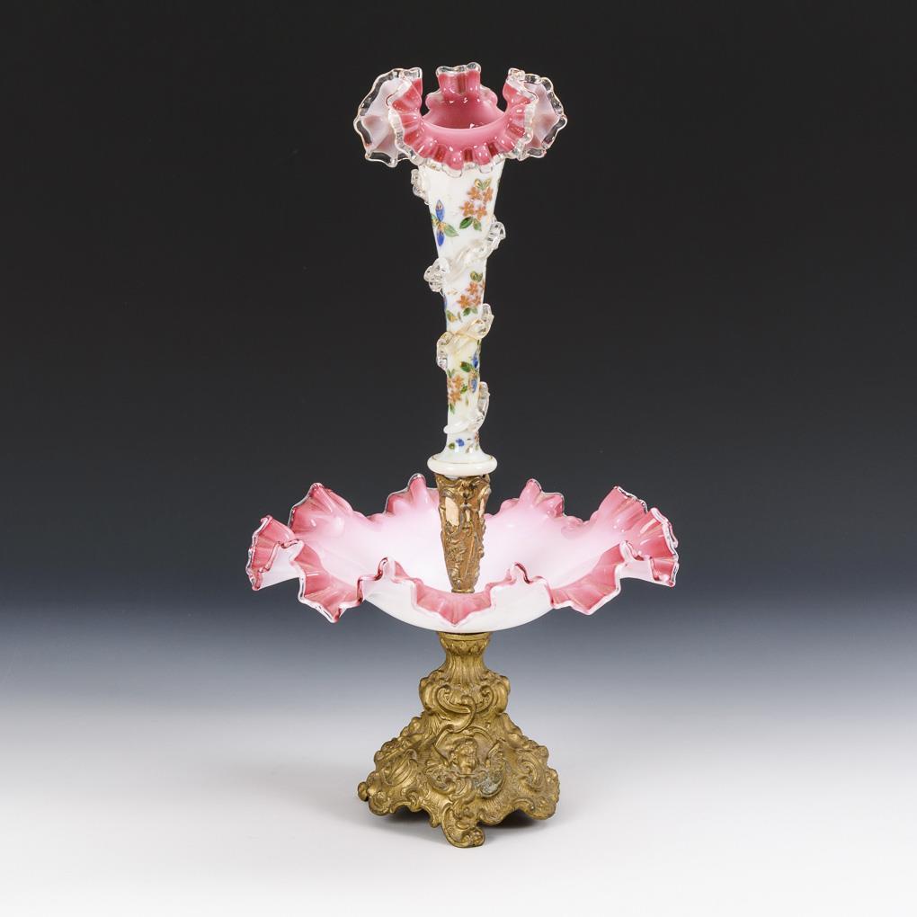 Opalglas mit rosa Randverlauf und aufgeschmolzenem Klarglasfaden am Rand, polychrome Emailmalerei, Goldstaffage; Zinn, goldfarben staffiert. H 43 cm.