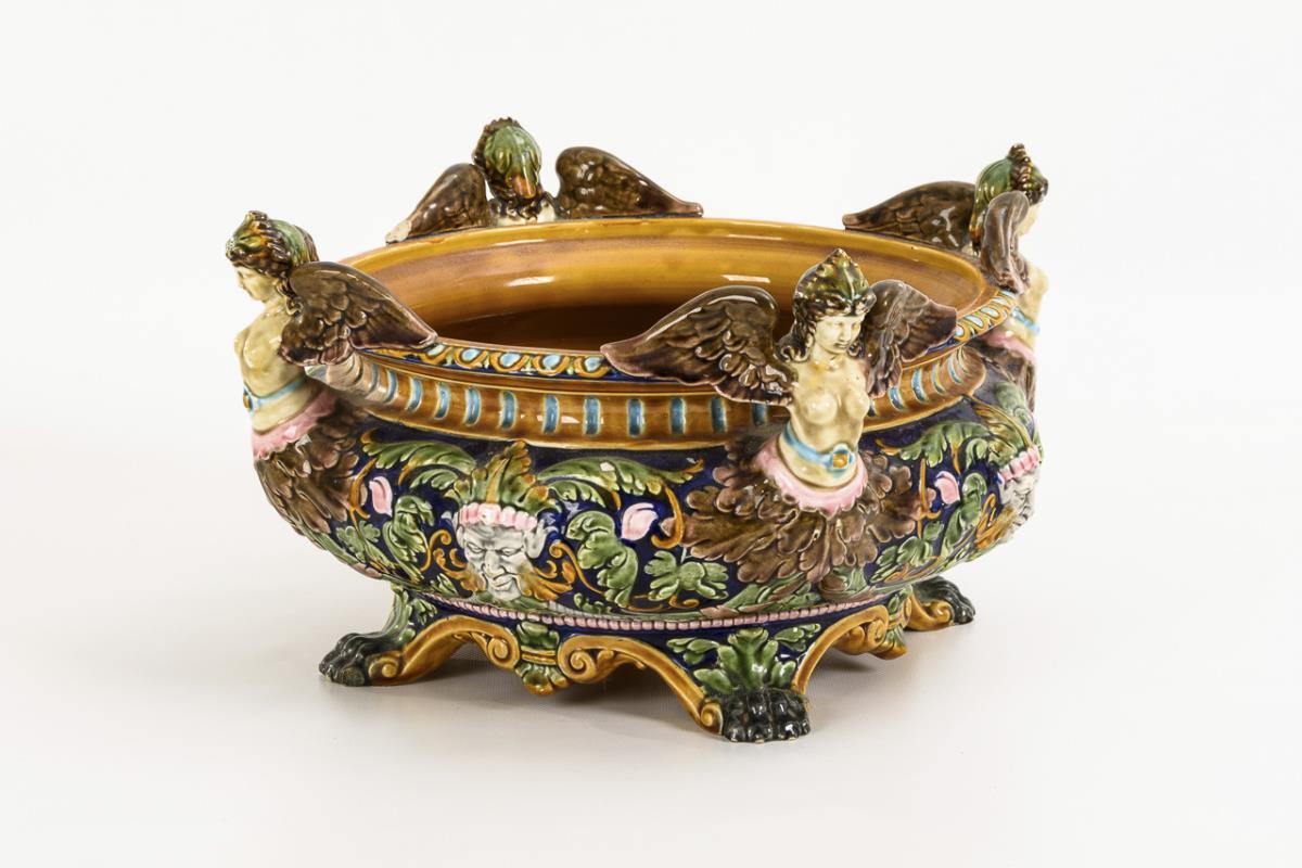 Gründerzeit-Reliefschale mit 4 geflügelten, weiblichen Mischwesen, Maskaronen und Blattwerk, auf 4 Tatzenfüßen. Bestoßungen, Fehlstellen, teils retuschiert.