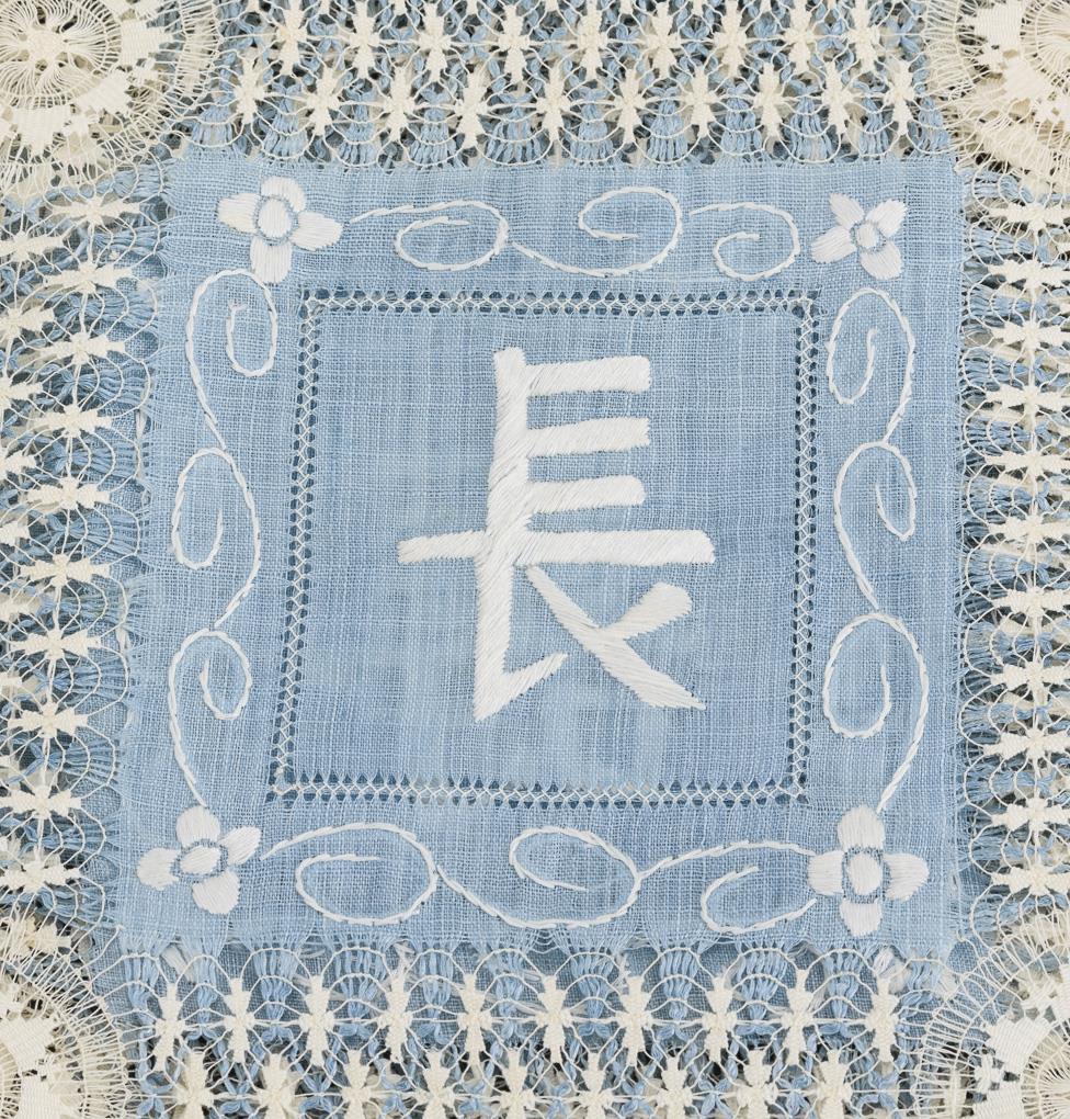 Feines Tuch mit großen, gestickten Drachenmotiven, Floralstickereien und asiatische Zeichen. Dazwischen verschieden handgearbeitete Spitzeneinsätze. Partielle Randflecken.