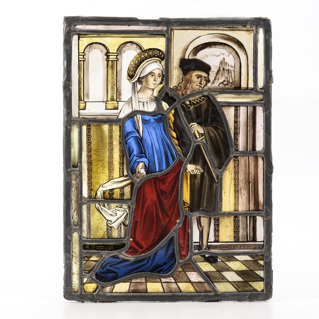 Klarglas und Farbglas, teils gebeizt und bemalt, Bleiruten. 28,5 x 21 cm.