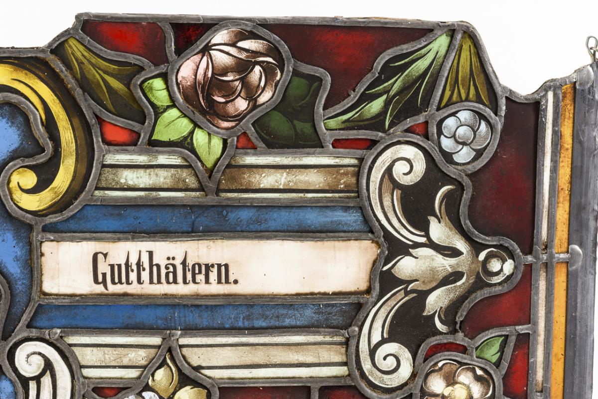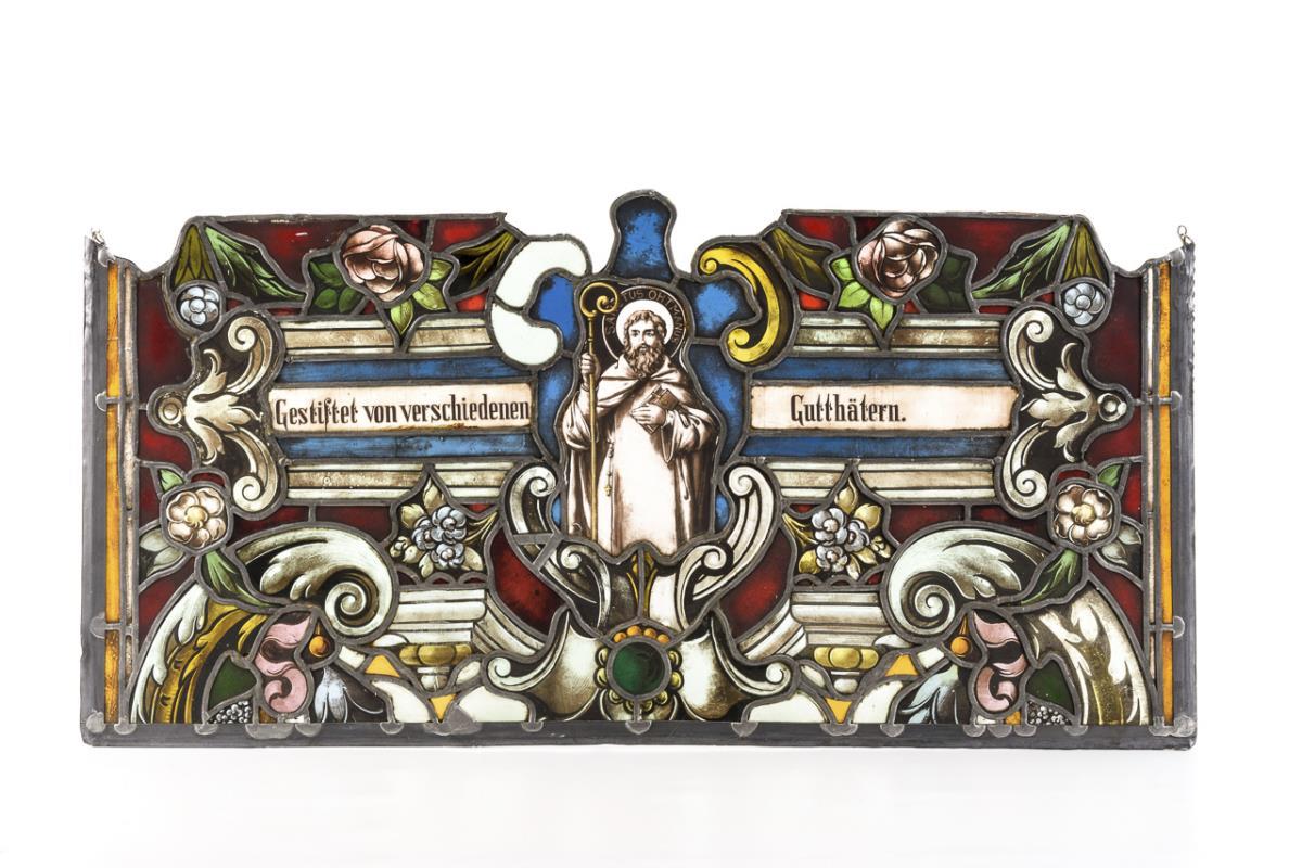 Wohl aus einem Kirchenfenster stammendes Fenster mit dem Heiligen Mönch und Blumen-Ornament sowie Vermerk: "Gestiftet von verschiedenen Gutthätern". Wenige Gläser gesprungen, Bleiruten teils gelöst.