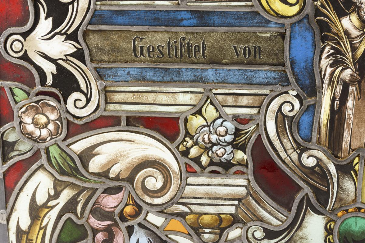 Wohl aus einem Kirchenfenster stammendes Fenster mit dem Heiligen Bischof und Blumen-Ornament sowie Vermerk: "Gestiftet von Pfarrer Paul Scherer". Einige Glasbrüche und Ausbesserungen, starke Alters-/Gebrauchsspuren.