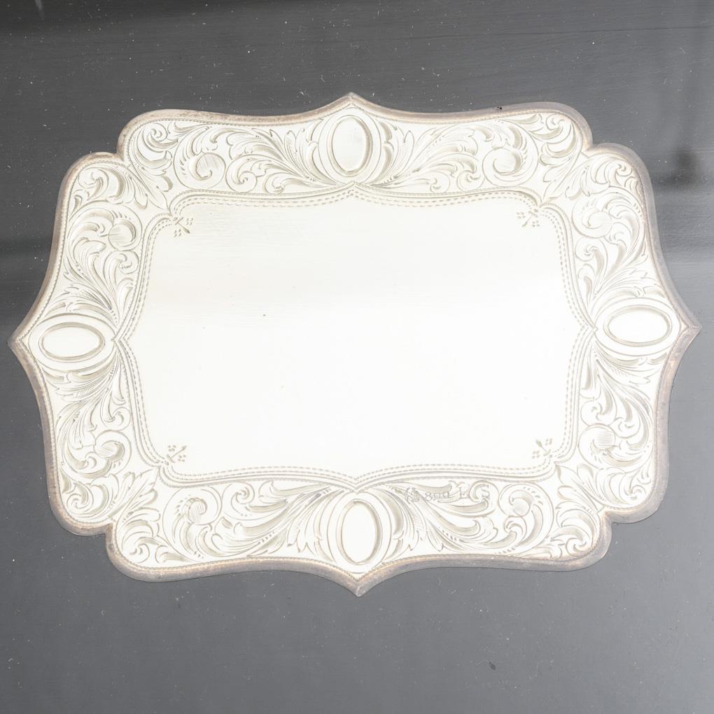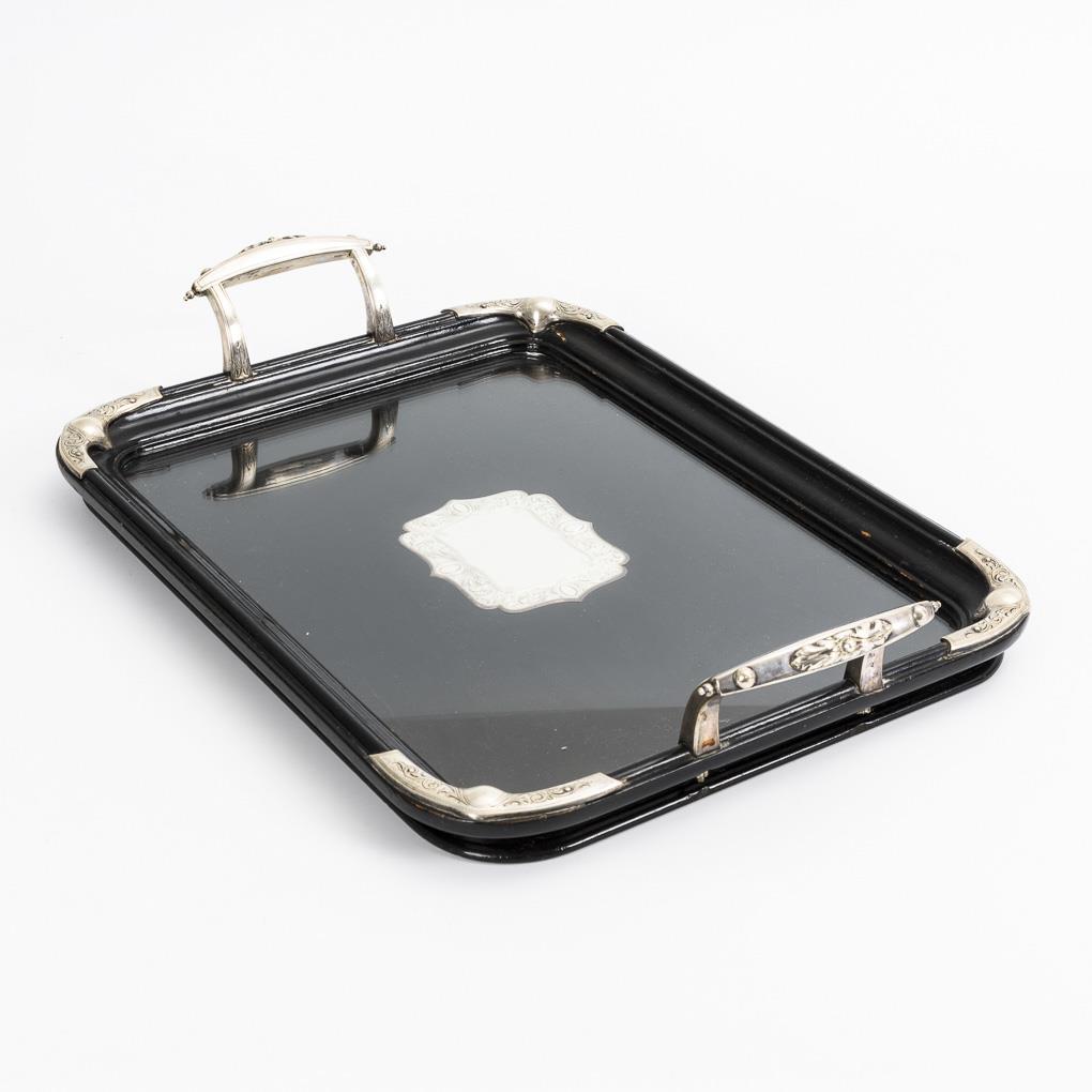 Rechteckiges Tablett mit 2 Silbergriffen und verglaster Fläche. Leichte Alters- und Gebrauchsspuren, innen 1 Teil lose (nicht sichtbar).