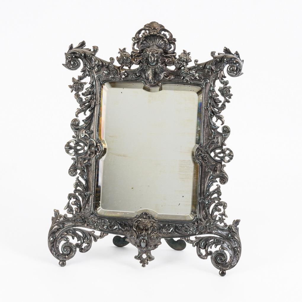 Metallguss versilbert, Spiegelglas. 44 x 32 cm.