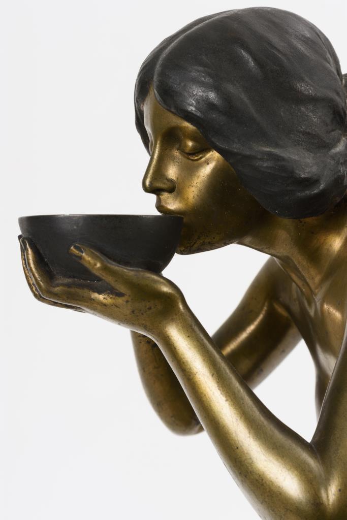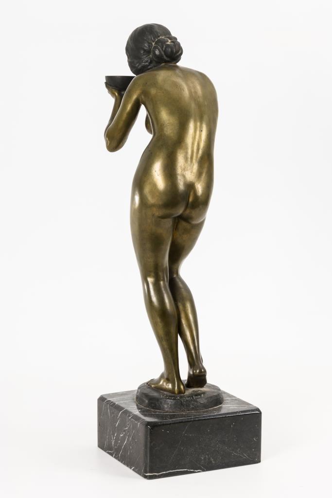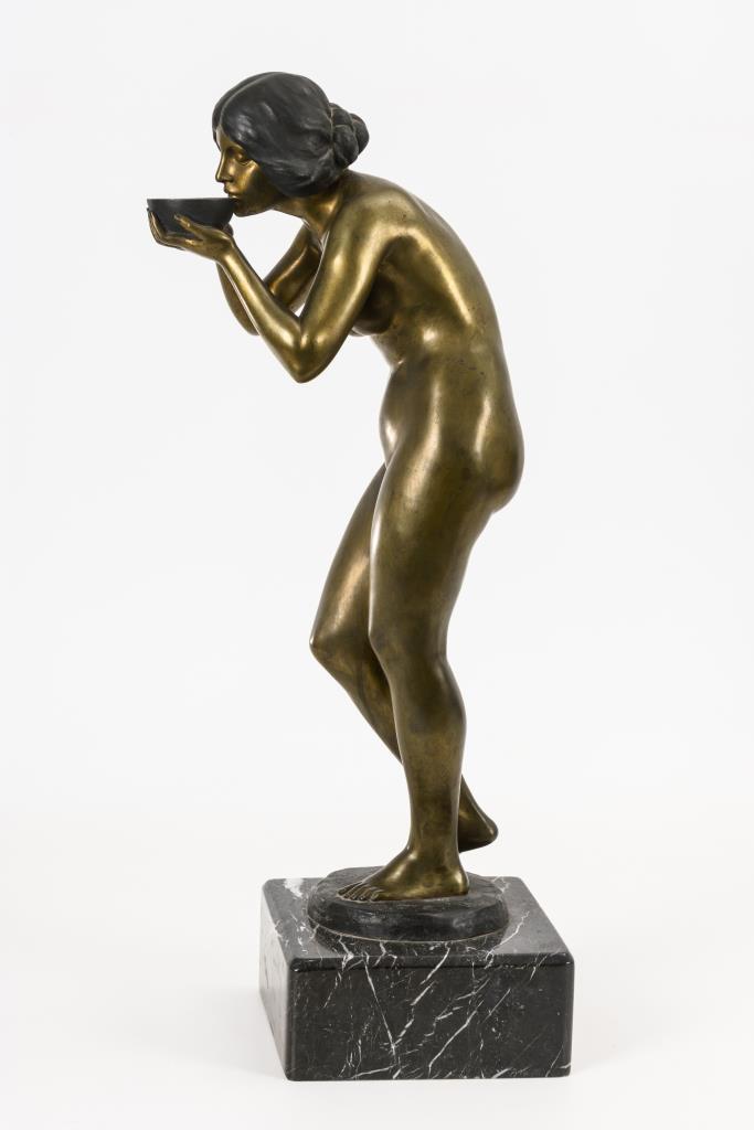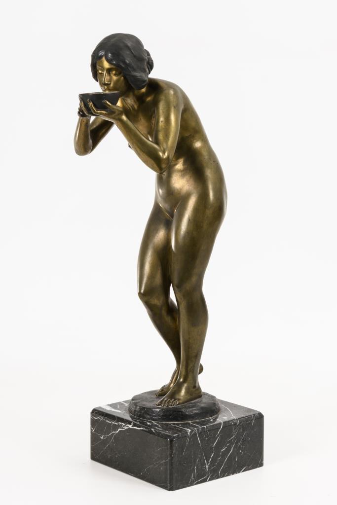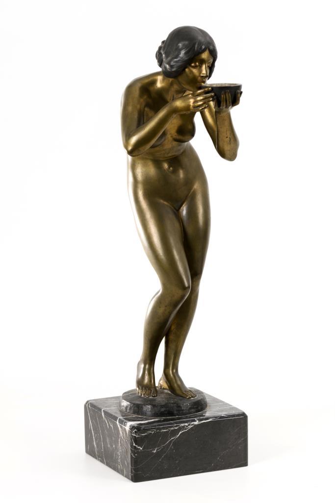 Stehender Akt einer Frau beim Trinken aus der Schale. Leichte Alters-/Gebrauchsspuren.
