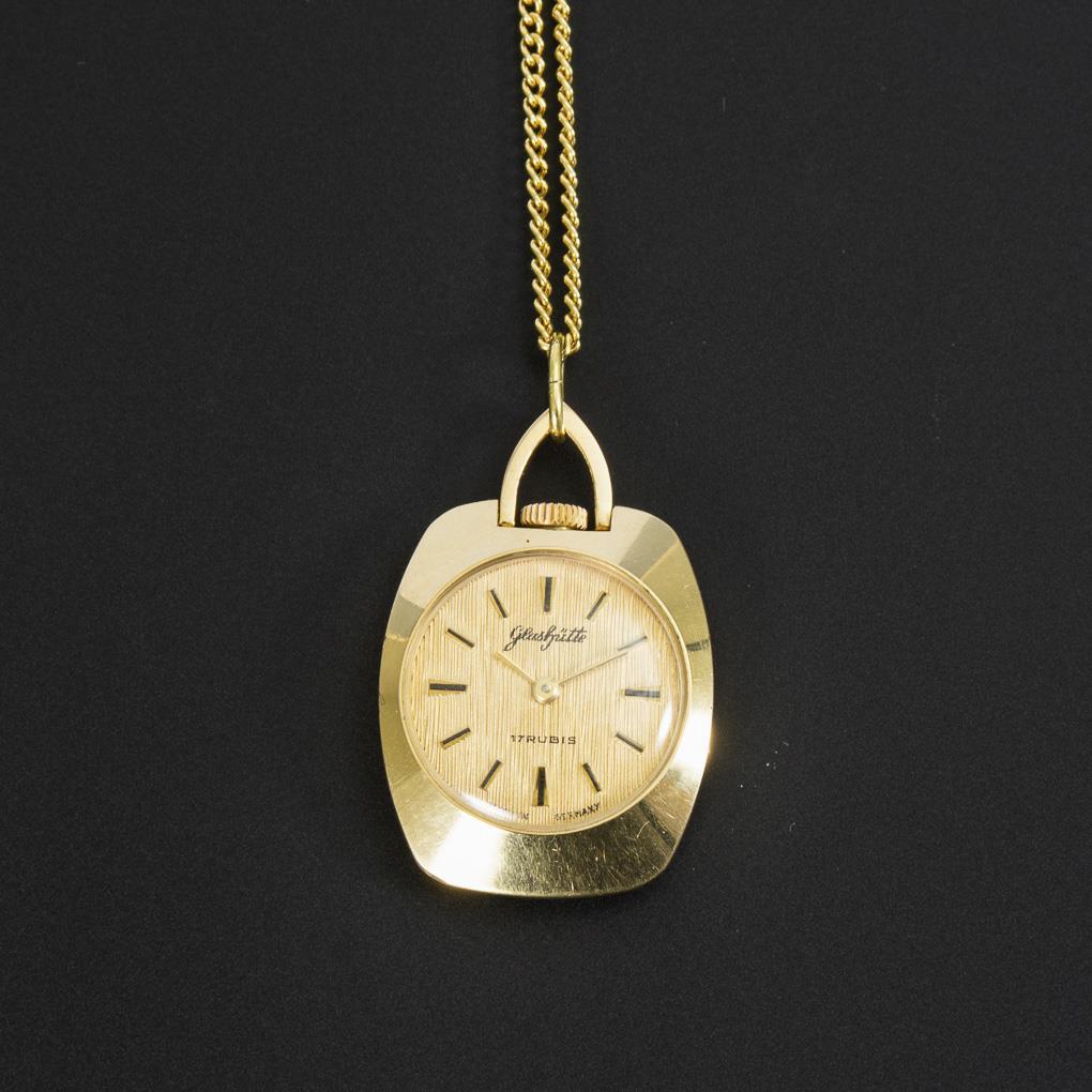 Vergoldet. Uhr 3 x 4,4 cm. Kette L 110 cm. 21,3 g.