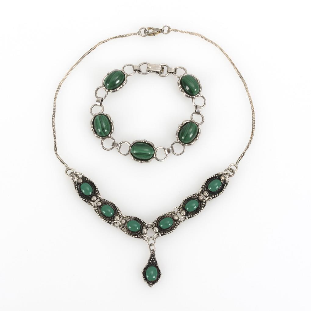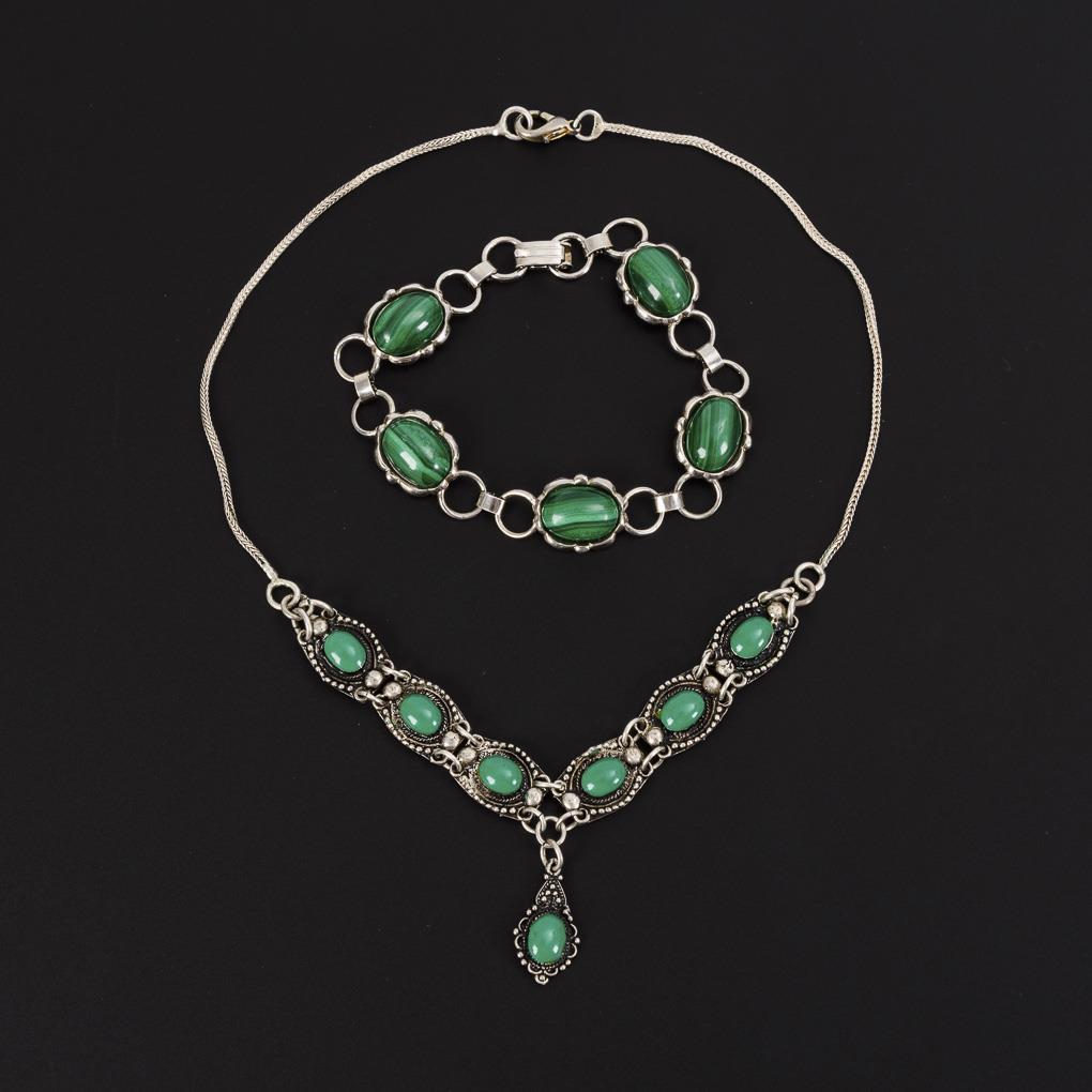 Armband mit Malachitcabochons an Klippverschluss. Collier mit Cabochons? zwischen Zierkette mit Karabinerschließe.