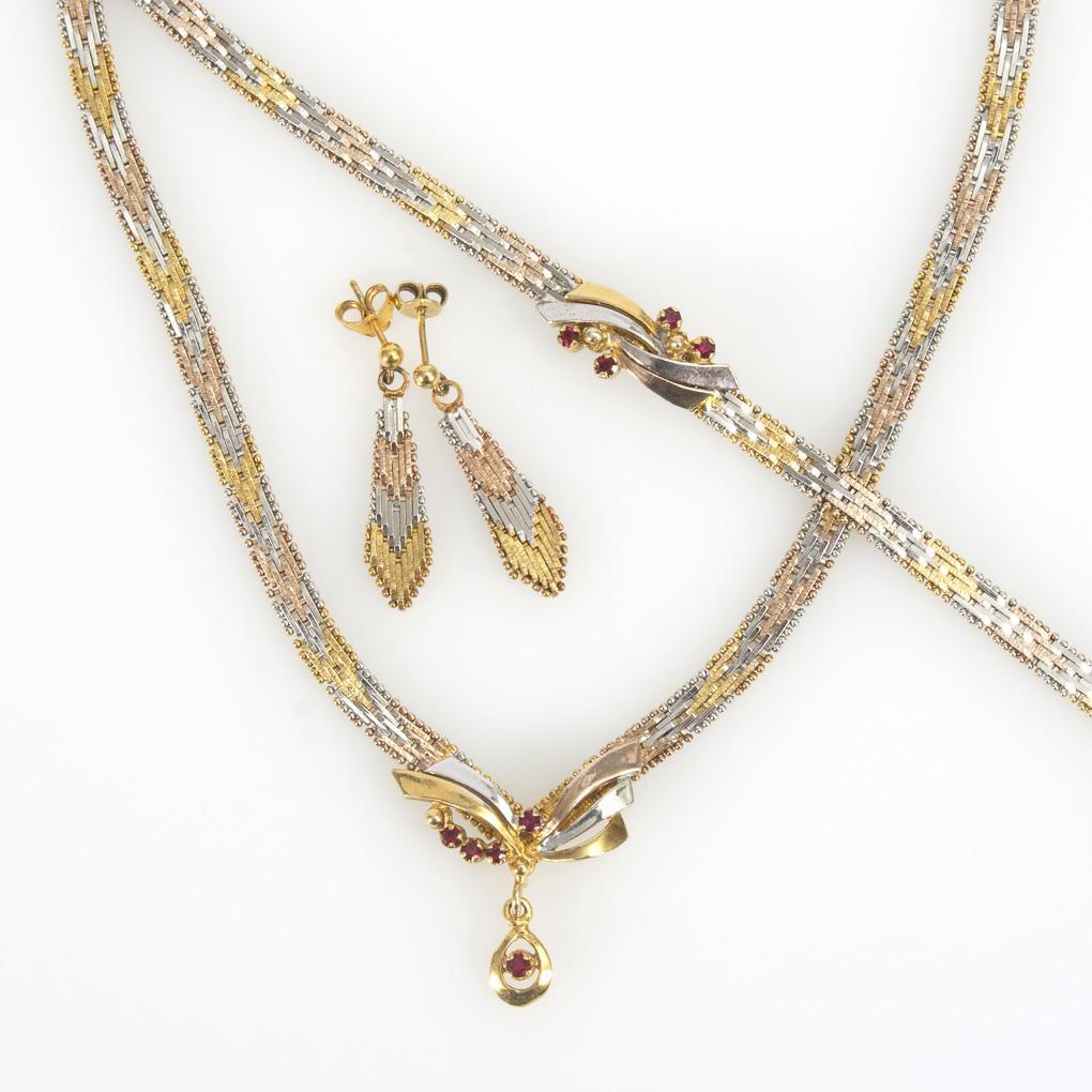 Collier und Armband mit kleinen Imitationen auf Ziergliedern. Kastenschlösser mit Achtersicherung. Passendes Ohrsteckerpaar mit Steckmechanik.