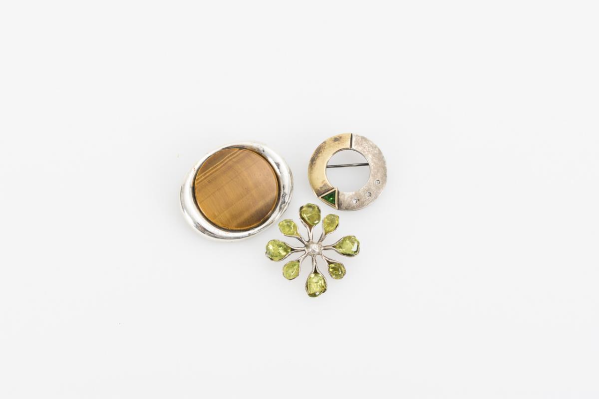 Broschen mit Tigerauge und grünen Steinen? und Ringbrosche mit Teilvergoldung. Kugelhaken.