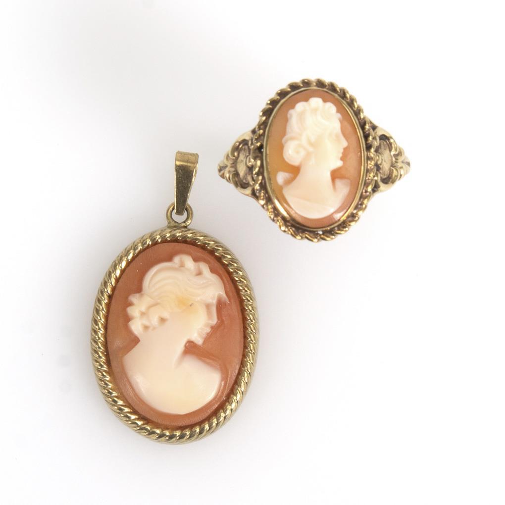 Kameen mit geschnittenen Frauenprofilköpfen in verzierten Rahmen. Ring mit schmaler Schiene.
