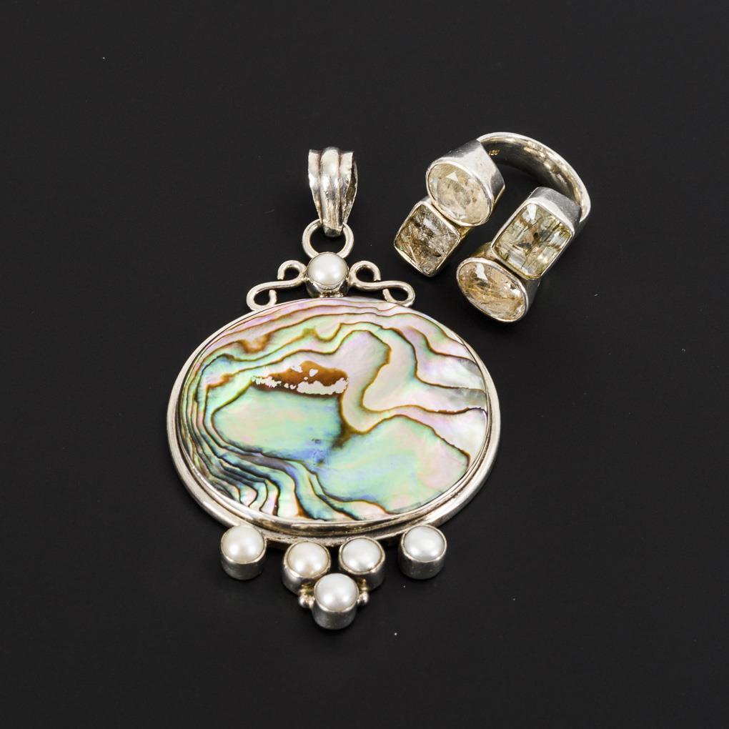 Großer Anhänger mit Pauamuschel-Einlage und Zuchtperlen. Offener Designer-Ring mit Rutilquarzen in hohen Zargen. Breite Schiene.