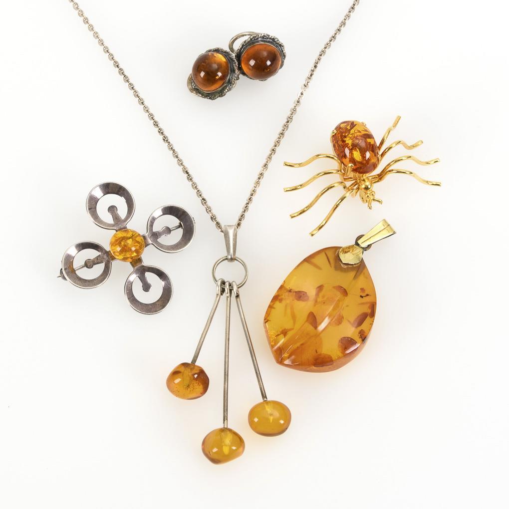 Anhänger mit Bernsteinkugeln an Ankerkette mit Ringfederschließe. Bernsteinkugel auf Silberzier mit Kugelhaken. Ohrklipp-Paar mit Cabochons an Klippmechanik. Bernsteinanhänger an Metall-Öse. Brosche als Spinne mit Bernsteincabochon an Metall-Kugelhaken.
