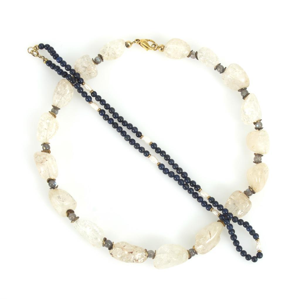 Schnürketten mit Bergkristallen und Labradoritkugeln, kleinen Lapiskugeln und Zuchtperlen.