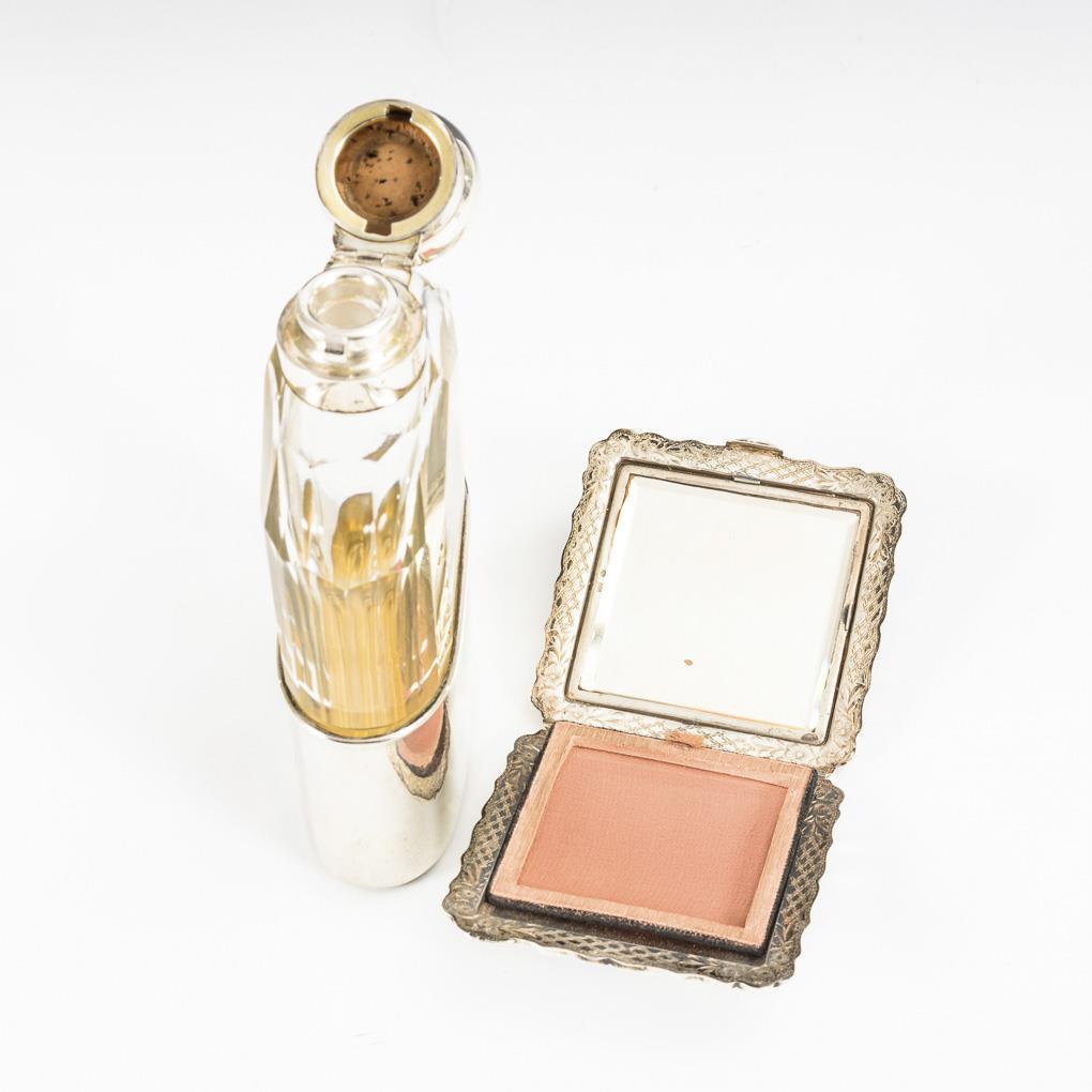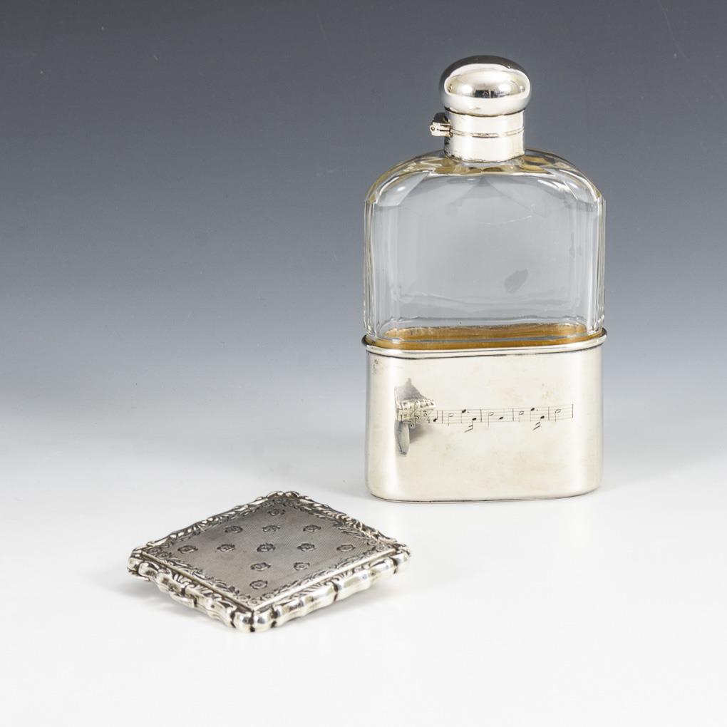 Flachmann oder sogenannter Taschenrutscher mit Scharnierdeckel, Silberhülle mit gravierter Notenzeile. / Quadratische Puderdose mit Blüten- und Rippenzier. Innen Spiegel und alter Pudereinsatz. Minimale Altersspuren.