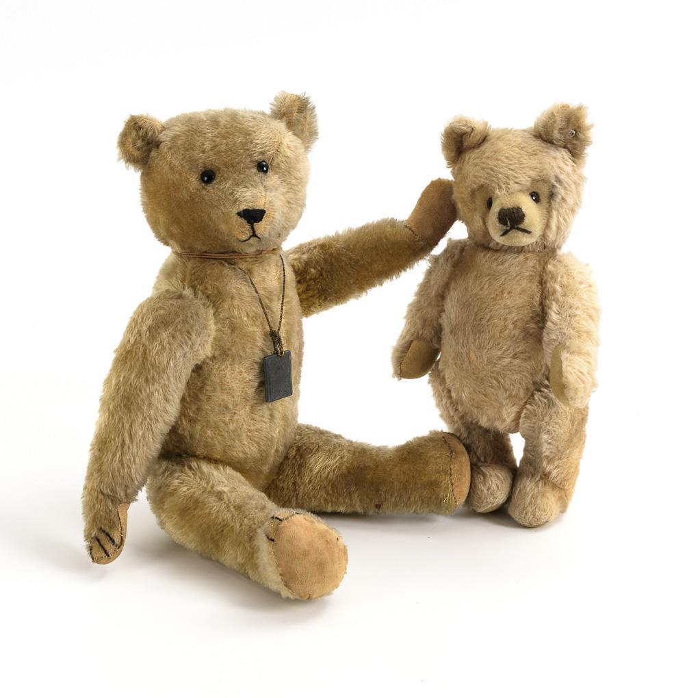Blonde Bären mit drehbarem Kopf und Scheibengelenken. Der größere mit Schuhknopfaugen, gebogenen Armen und intakter Stimme, Pfoten übernäht. 1 Auge mit Fehlstelle.