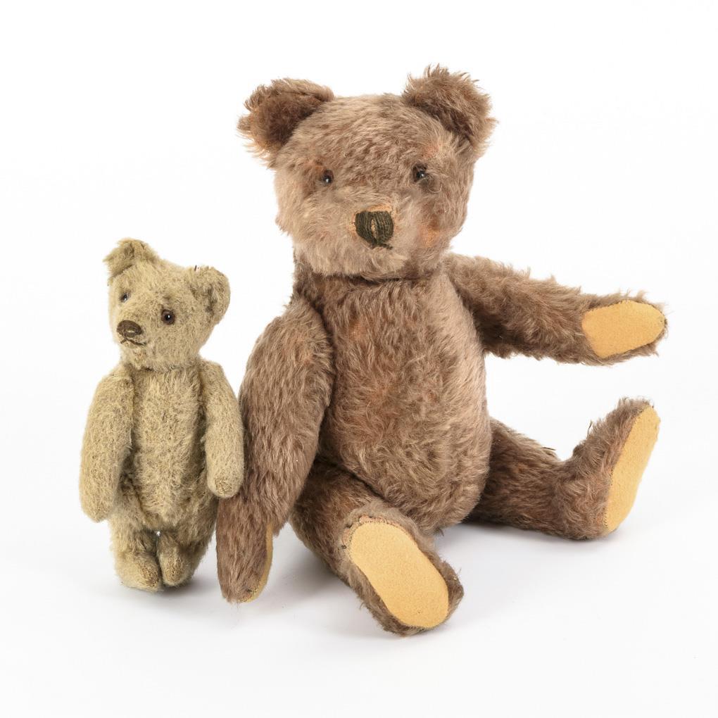Beide mit Glasaugen, drehbarem Kopf und Scheibengelenken. Der größere mit Filzpfoten. Altersspuren.