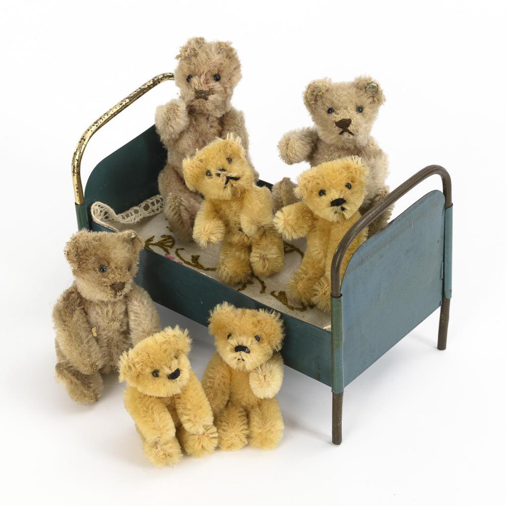 Blechbett und 7 Miniatur-Teddys. Steiff & Schuco.