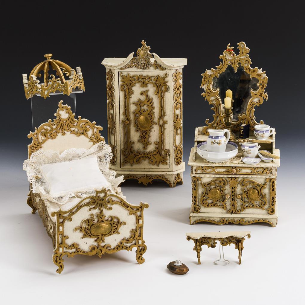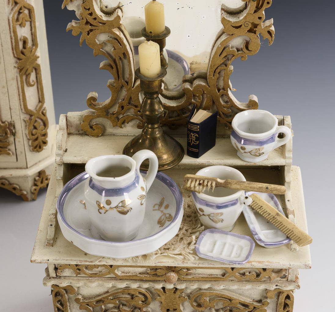 Schrank, Waschkommode und Bett mit Baldachin. Dazu kleines Wandbord, Fragmente von 2 Stühlen und etwas Zubehör (Waschutensilien, Kerzenleuchter). Mit Defekten.