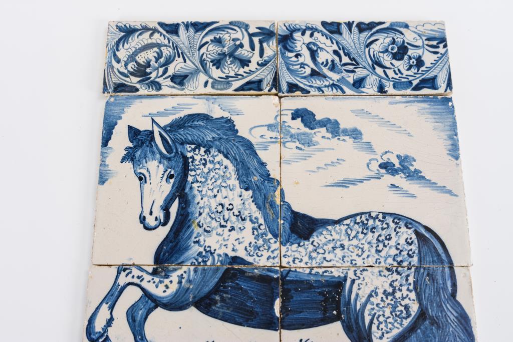 Quadratischer Bildspiegel mit steigendem Hengst und Bordürenstreifen. Alters- und Gebrauchsspuren, teils restauriert.
