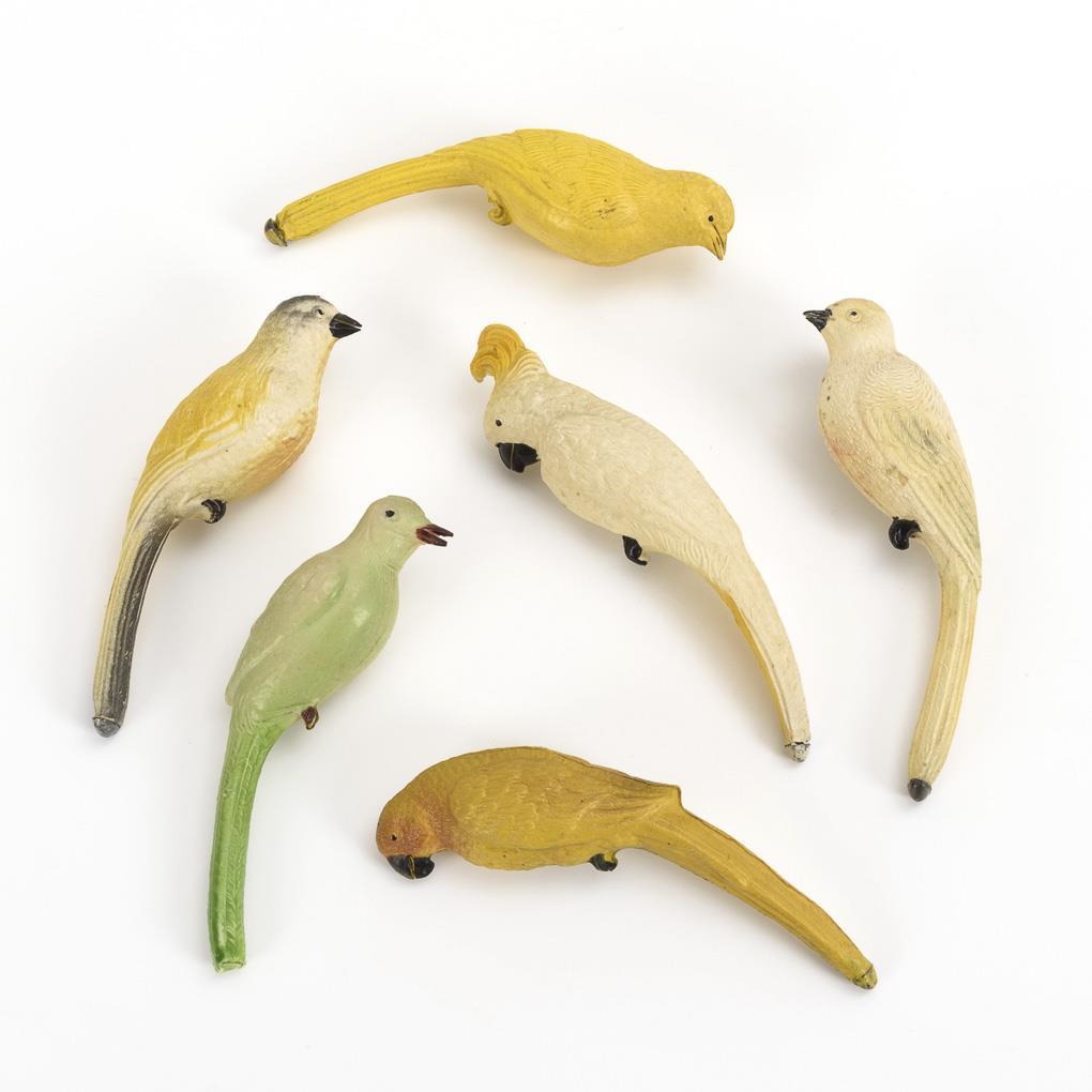 6 Celluloid-Vögel als Rasseln.